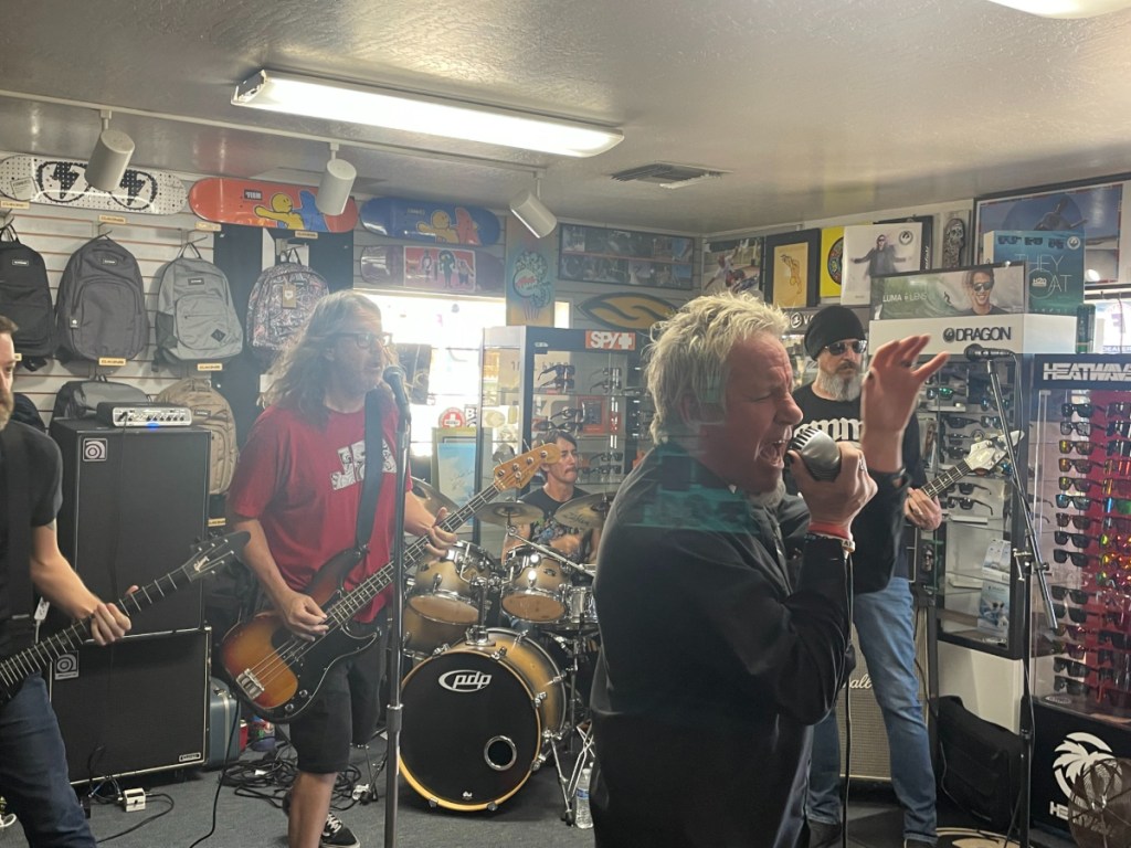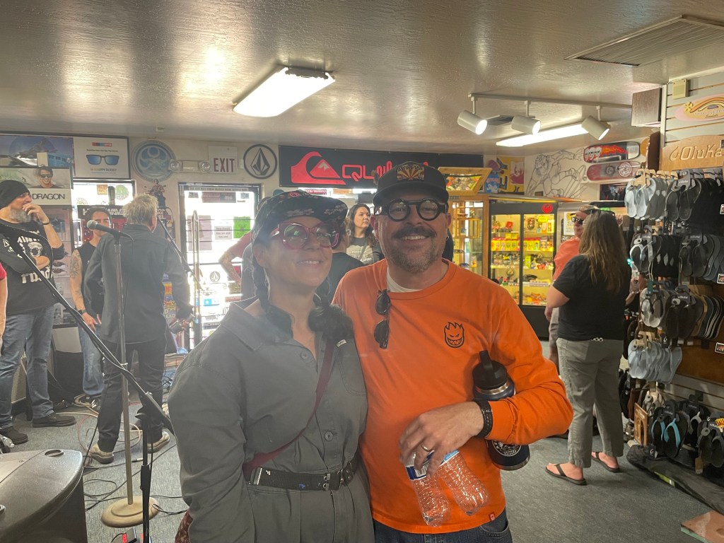 Fat Gray Cat playing for the Sidewalk Surfer crowd at a prior anniversary shop celebration in 2024.