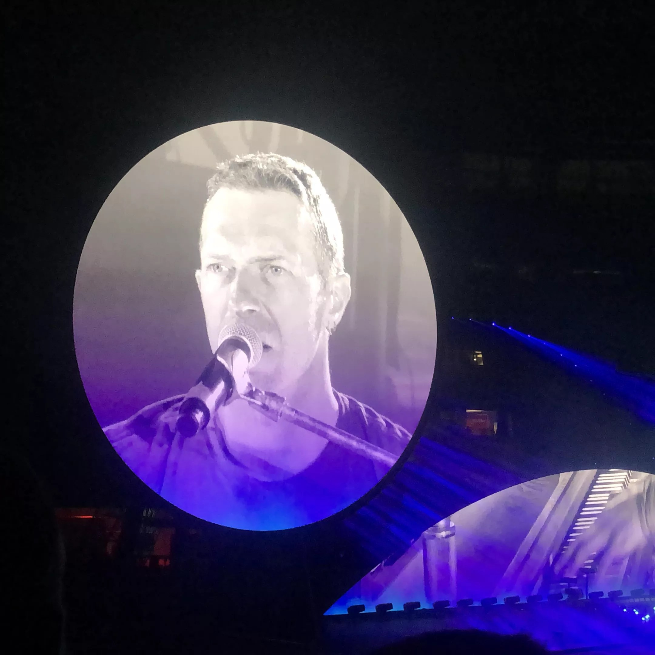 Chris Martin appears on giant screens during Coldplay’s concert at State Farm Stadium in Glendale.