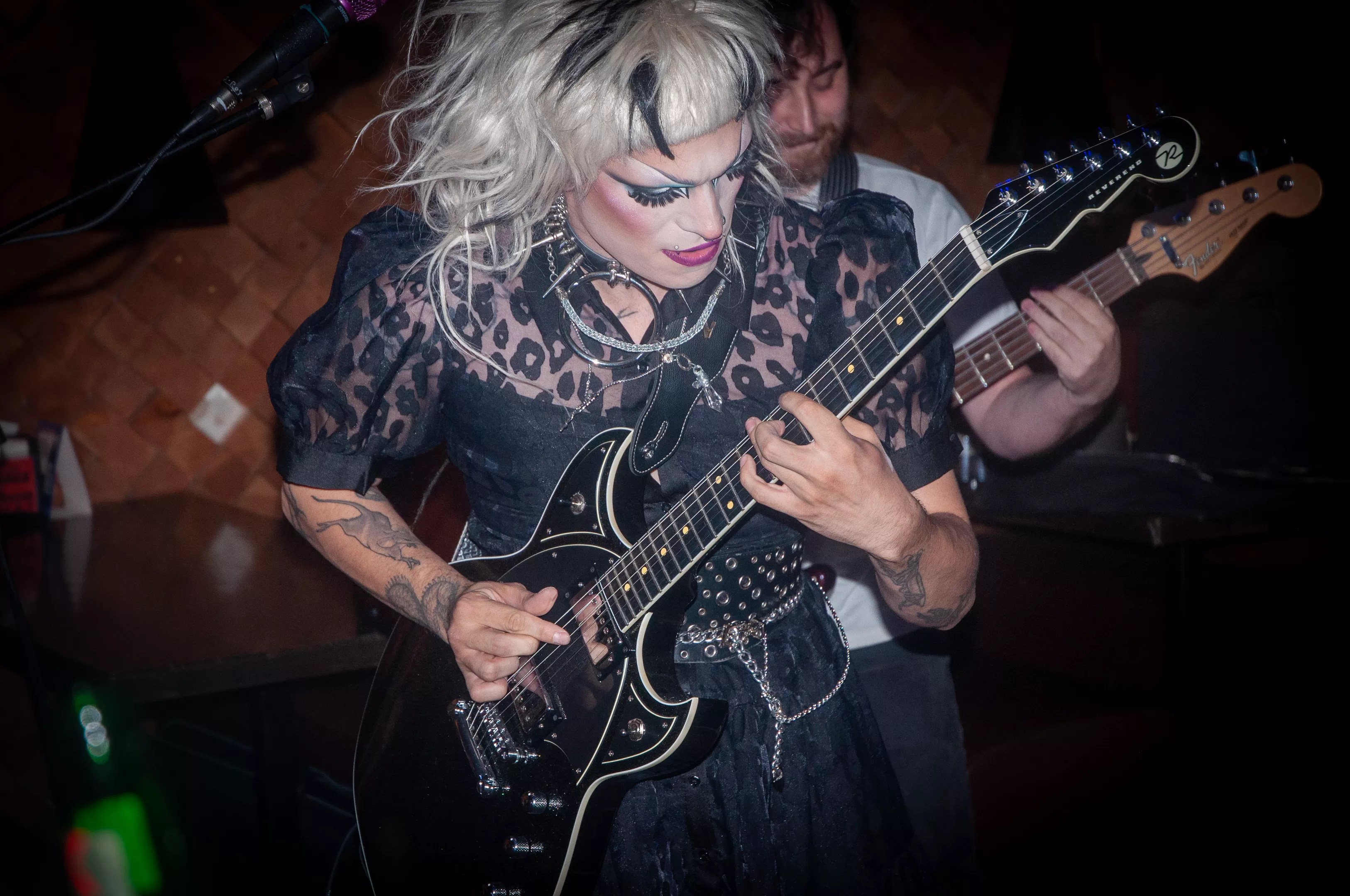 After the first drag set concluded, Astrud and her band delivered an unexpectedly psychedelic performance featuring completely original tunes. While the set itself only featured “a few songs,” each track easily eclipsed a radio edit’s running time. Astrud glided her hands up and down the neck of the guitars like someone classically trained, and clearly strived for aural perfection in the songwriting and sound departments. The gritty texture of Astrud’s voice, which had the character of a fanfare trumpet, struck out in specific directions, yet was never overpowered by the instrumentals. Guitarist Calin Gross complements Astrud’s parts with some bad-ass solos, with Brandon Biallis on bass and Spencer Ferrarin on drums giving us some slithery rhythm and percussion.