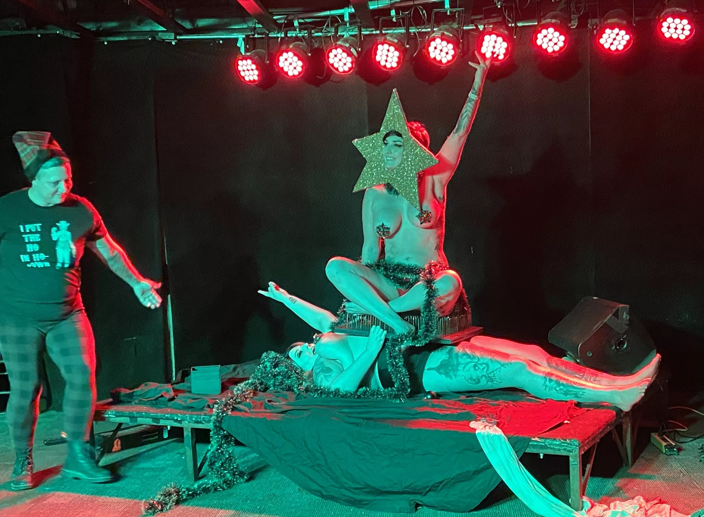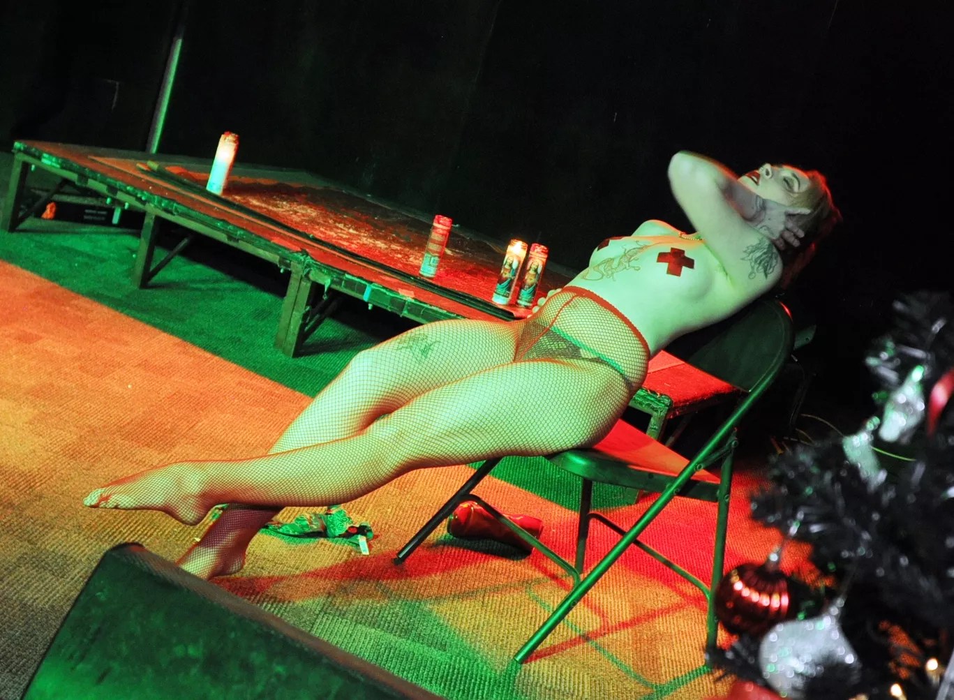 Irene Silver becomes a sexy Christmas tree atop a bed of nails while performing a stack act with Britini Bloodshed (who is lying on broken glass).