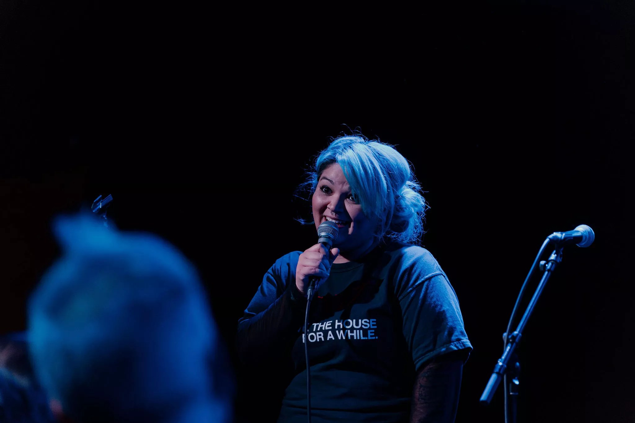 Becky Bell Ballard of Rosie’s House address the crowd during an intermission at Phoenix Rock Lottery.
