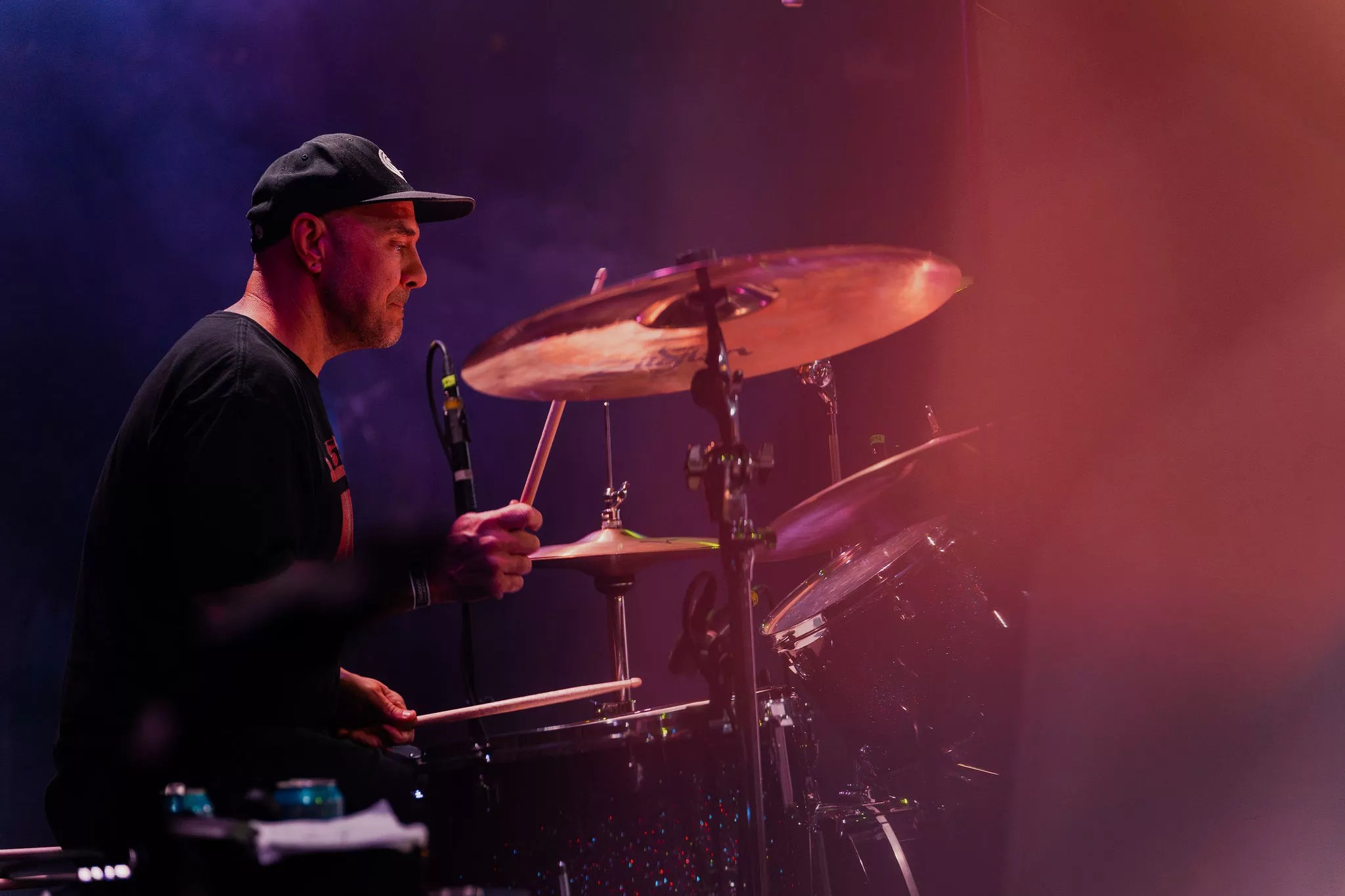Drummer Shane Ocell behind the kit during the set finale set from Ten Souls.