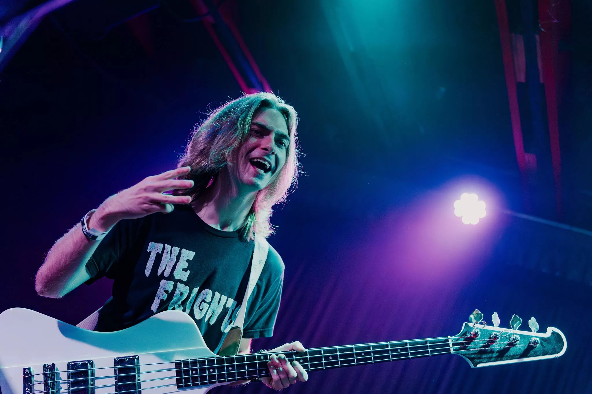 Wills Brinton plays bass during the set from The Peeling Ceilings.