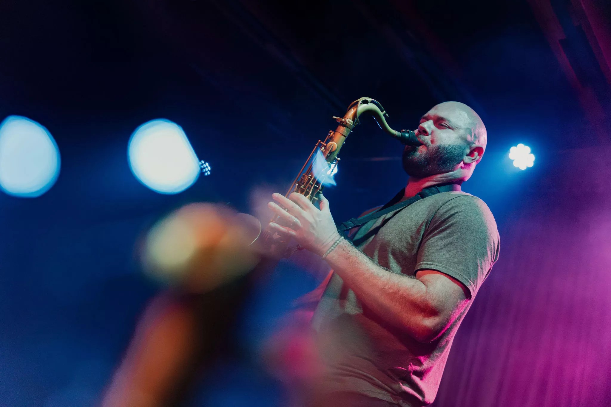 Chaz Fertal blows his horn during the set from The Peeling Ceilings.