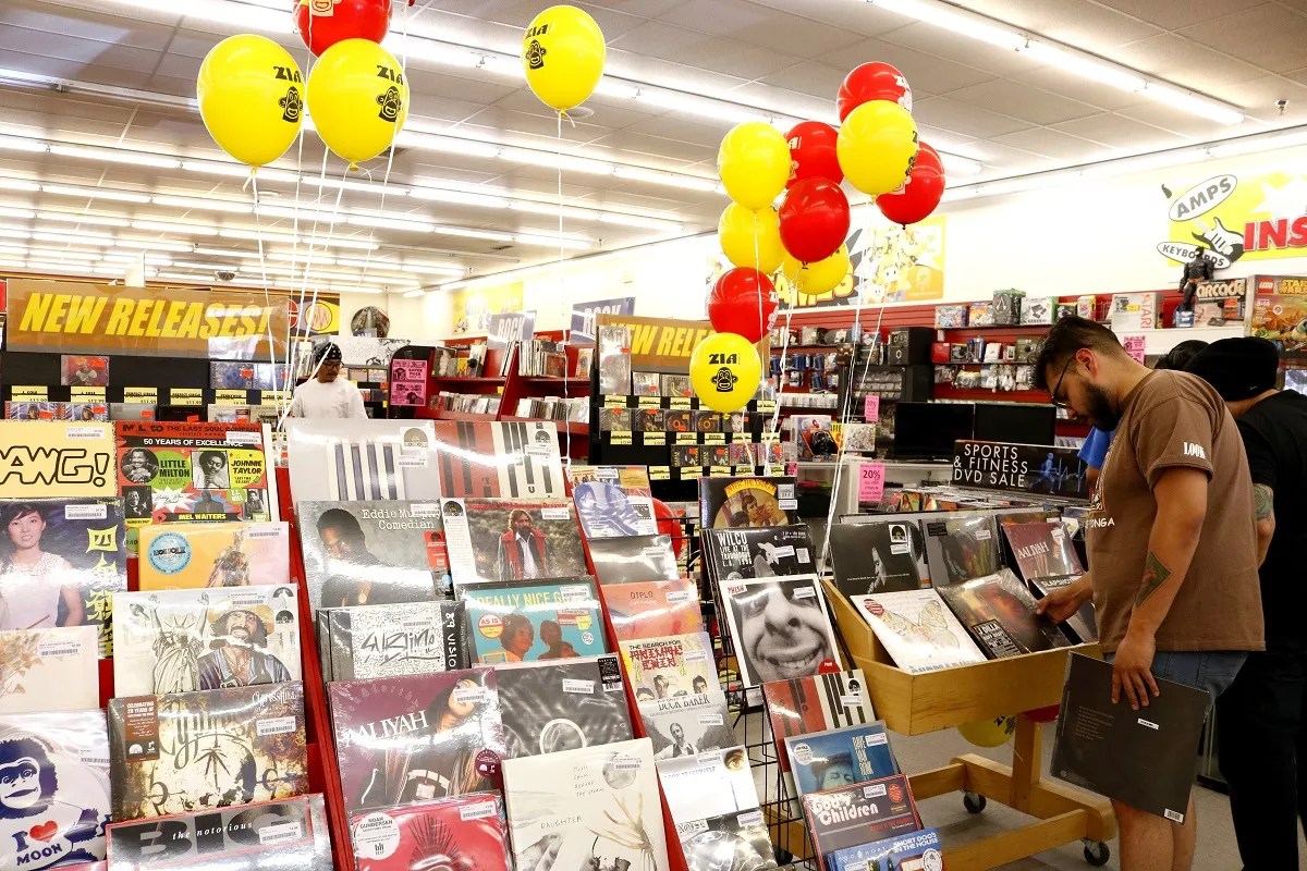 Shoppers at Zia Records browse the bins.