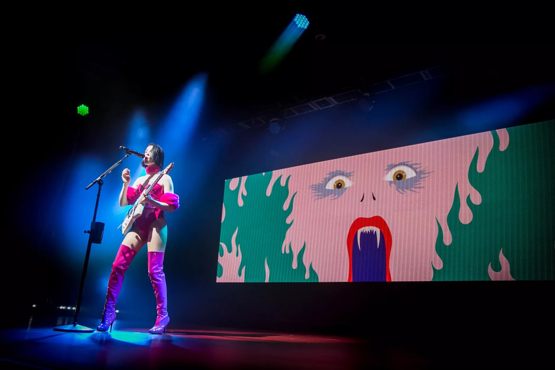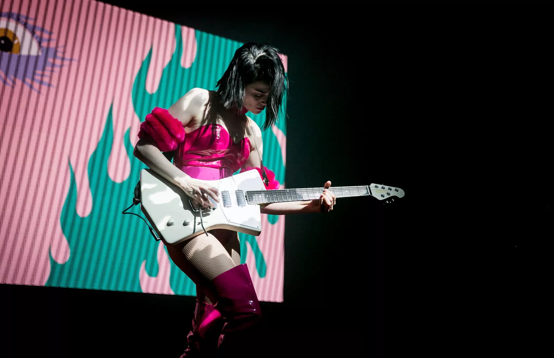 When the lights went down, the curtains only opened halfway to reveal the artist – whose real name is Annie Clark – dressed in a neon pink latex bodysuit with matching thigh-high boots. Her dark hair was slicked back, and her skin was white and flawless under the stage lights.