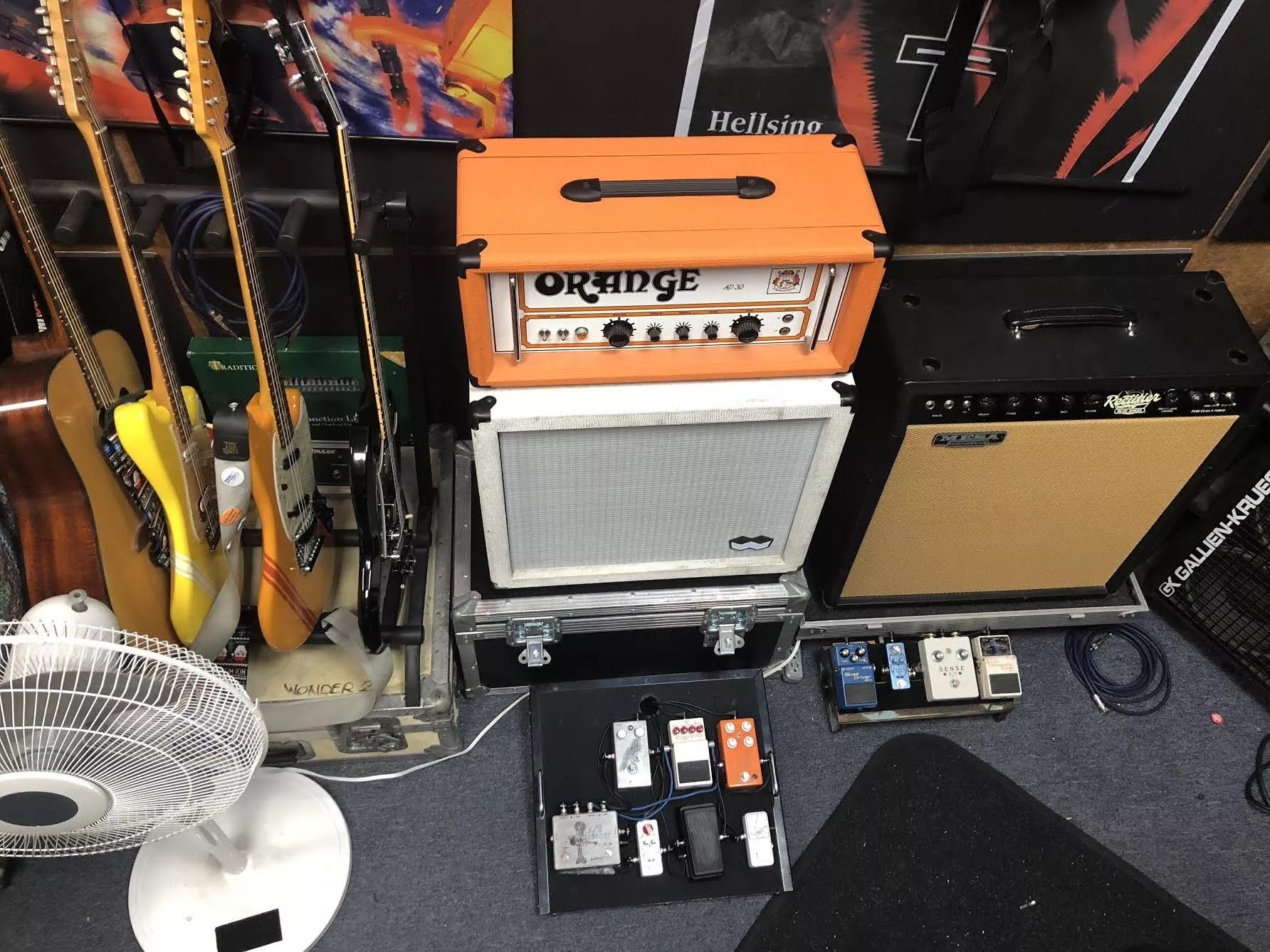 That being said, I do have gear preferences that make my job easier, either because they help me achieve a signature sound, or really just because they inspire me, and make me feel comfortable on stage. My single-channel Orange AD30 is great because of its simplicity. Just master, gain, and 3-band equalizer. I set the gain just on the edge of breakup so I can push the amp into overdrive with pedals. I also like to leave the EQ flat because I enjoy the natural, default state of what the amp was designed to sound like, no dramatic mid-boosting or anything like that.