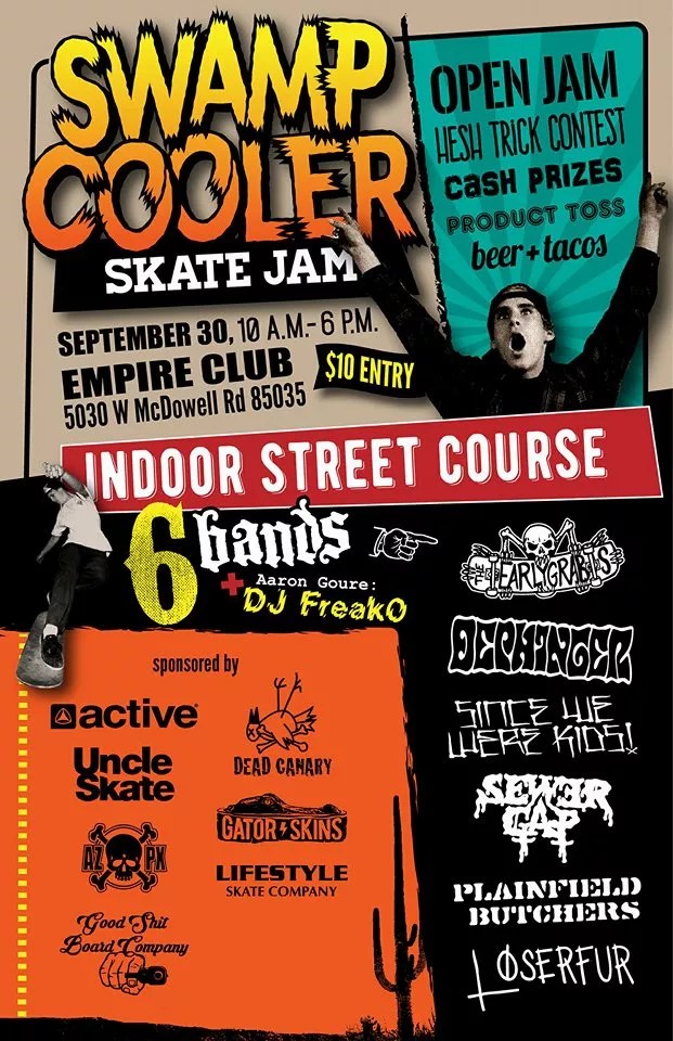 Before there were skate parks in almost every section of Phoenix, there were ramps, backyard pools, and DIY spots built by dedicated skateboarders. The Swamp Cooler Skate Jam will honor that skating legacy on Saturday, September 30, with a West Valley event pairing DIY skateboarding and skate rock.