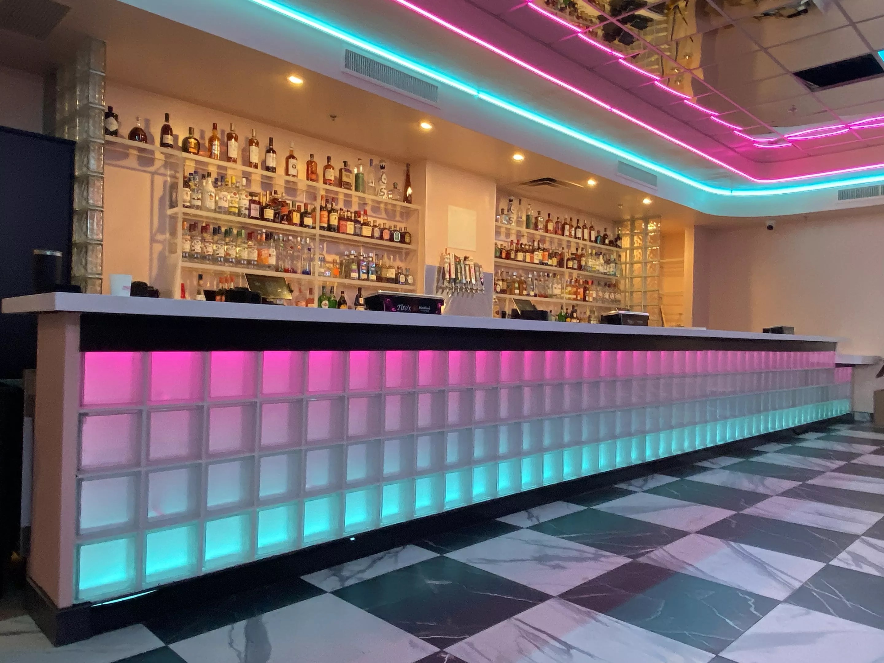 Thundercat Lounge’s main room features a large black and white checkered dance floor and neon lighting.