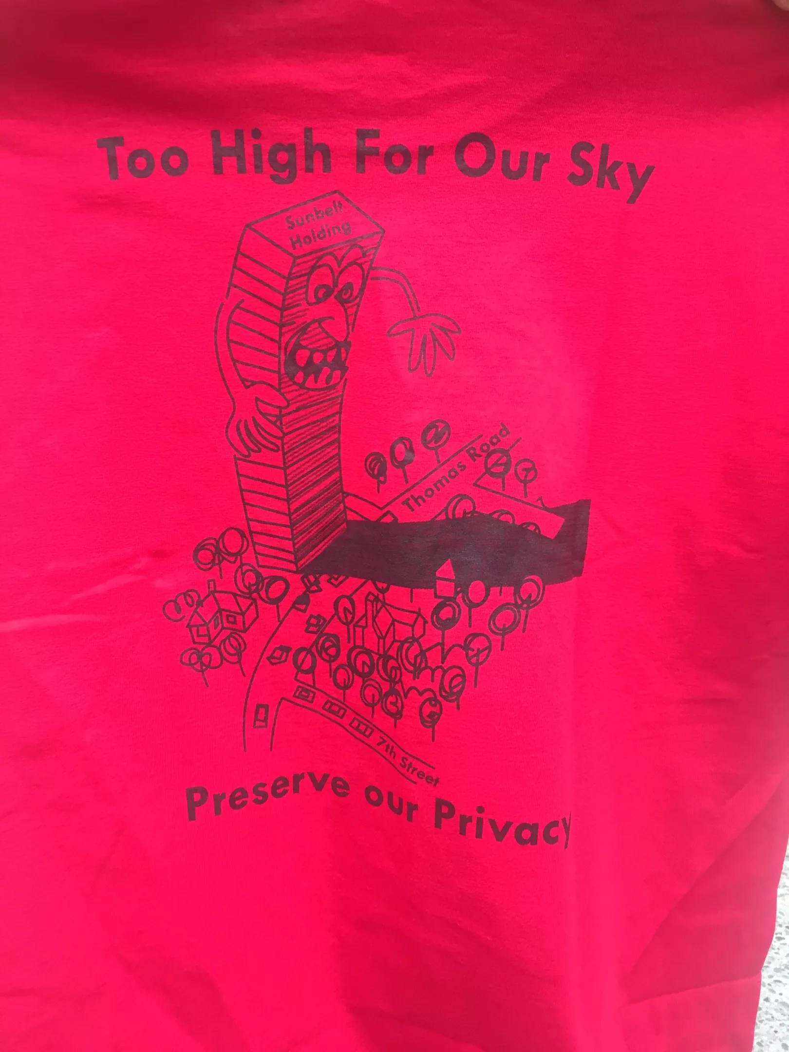 A few dozen residents arrived at Wednesday’s council meeting wearing bright red T-shirts with “Stop the Looming Tower” printed on the front and a cartoon of a skyscraper menacing Thomas Road on the back.