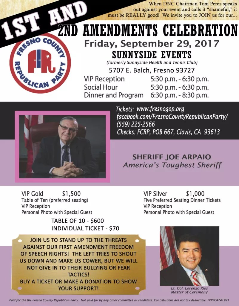 “Sheriff Joe is coming to Fresno …and the left can’t stand it! The Fresno County Republican Party (FCRP) would like to invite you to the third annual 2nd Amendment Barbecue to hear Sheriff Joe Arpaio, FCRP’s guest speaker. Once we saw the bullying coming from the left and the scare tactics they were employing to attempt to get us to cower, we knew this was about more than law enforcement and the 2nd Amendment … this is now also about standing up against those who want to strip us of our First Amendment Freedom of Speech …just because they don’t like it! Stand with the FCRP against their hate and buy a ticket or make a donation!”