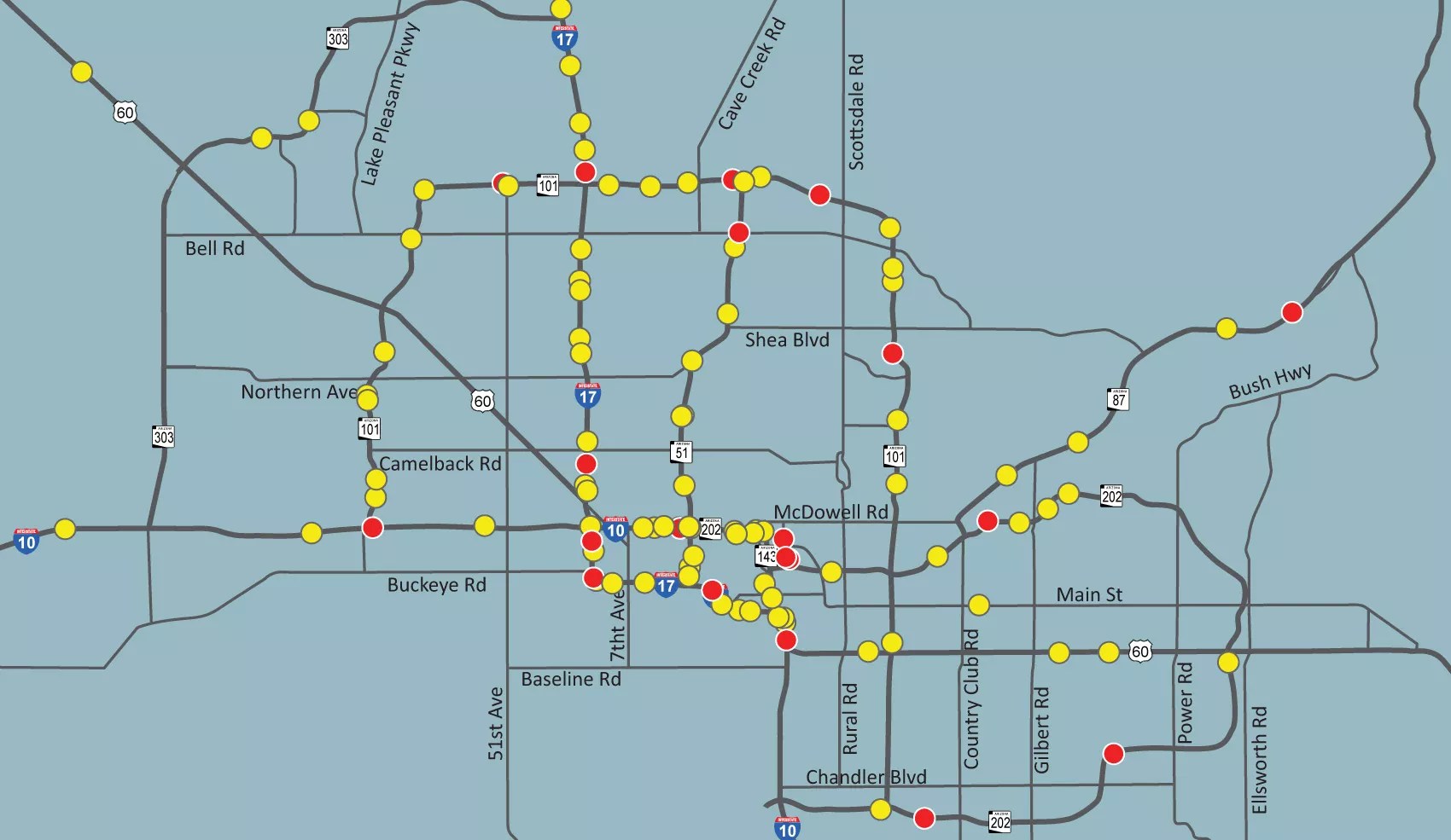 This map shows all the wrong-way crashes in the metro Phoenix from 2004 through 2014. Red dots indicate a fatal crash.