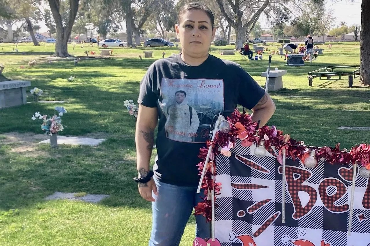Angelica Reyes at the grave of her son, Angel, who was shot and killed in 2021.