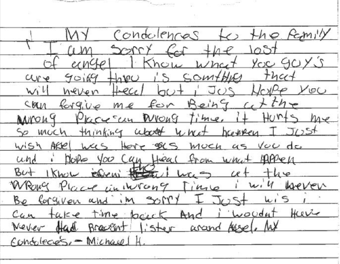 “I am sorry for the lost (sic) of Angel,” stated the letter, which Reyes said she obtained from police. “I know what you guys are going thru is something that will never heal, but I just hope you can forgive me for being at the wrong place, wrong time.”
