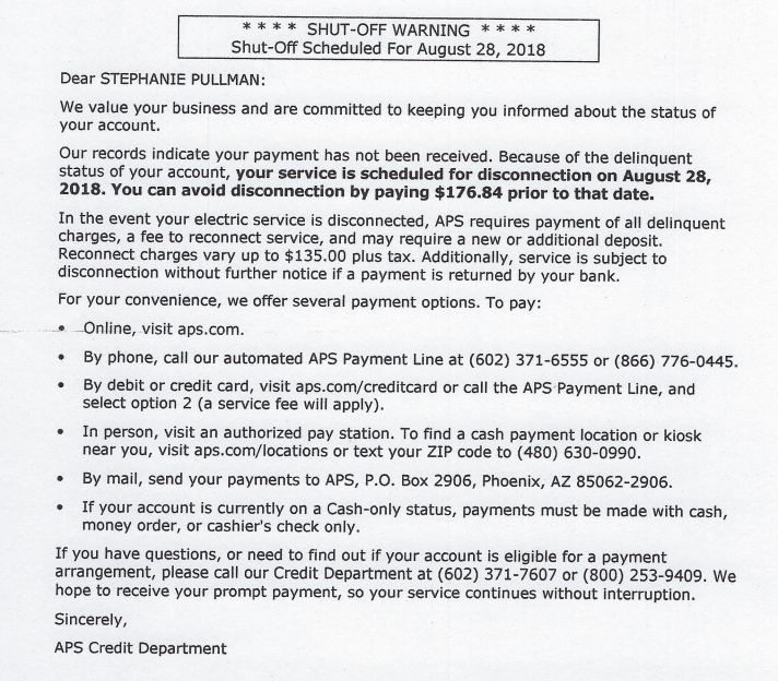 APS sent one shutoff warning to Stephanie Pullman, dated August 23, 2018. It gave her five days to pay her bill or lose power to her home.