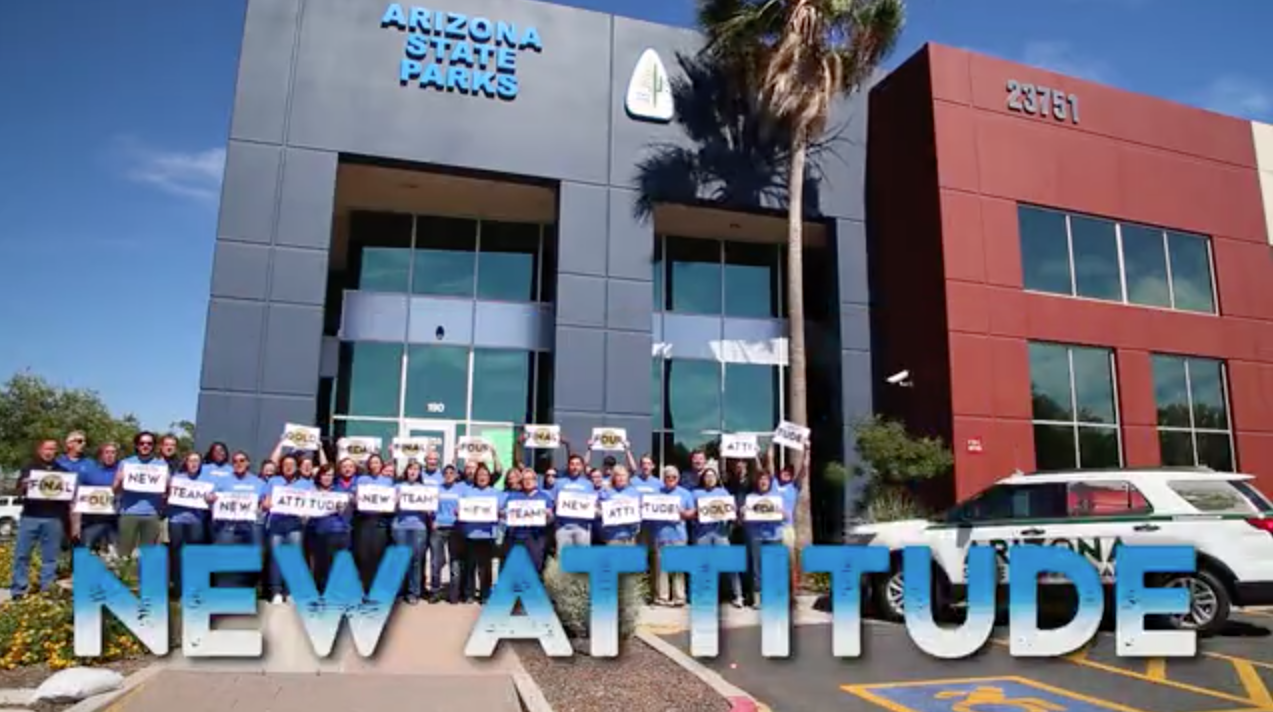In a still from Arizona State Parks’ video submission for the Gold Medal award, staff pose outside the agency’s north Phoenix headquarters.