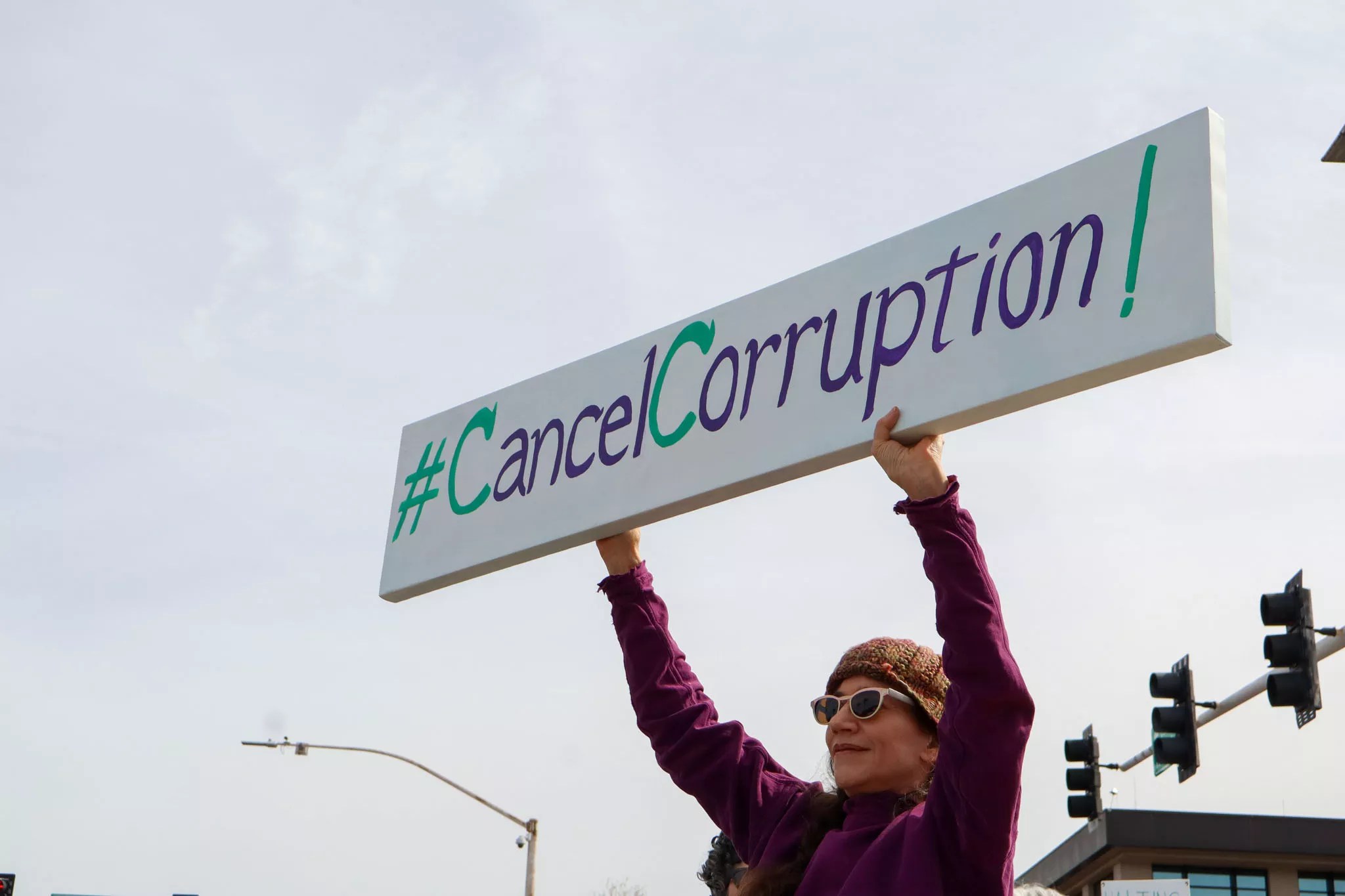 A protester stands near the office of GOP Rep. David Schweikert with a sign reading “Cancel Corruption.”