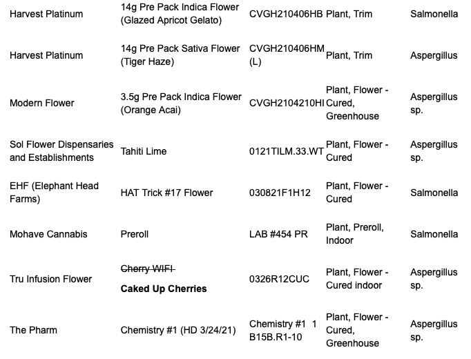 All the affected products were flower cannabis (a.k.a. buds), with brands including Harvest, Sol Flower, Tru Infusion, and others. See below for the state’s chart with a complete list of the products under recall.