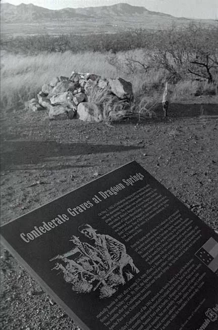Monument at the graves of four Confederate soldiers killed during a skirmish with the Chokonen band of the Chiricahua Apache, Dragoon Springs: The “monument” here is more of a historical marker placed there by the U.S. Forest Service – in cooperation with the Arizona Division of the Sons of Confederate Veterans – in 1999.