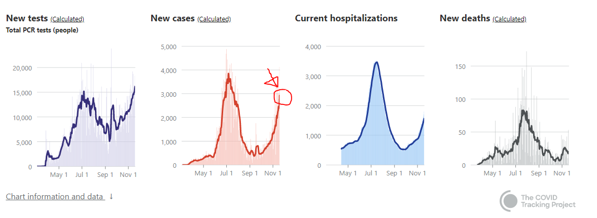 The state is averaging over 3,100 new cases of COVID-19 each day. That’s an increase of 1,100 more cases each day from just a week ago. The last time daily cases were this high and rising was July 1, five days before the summer peak.
