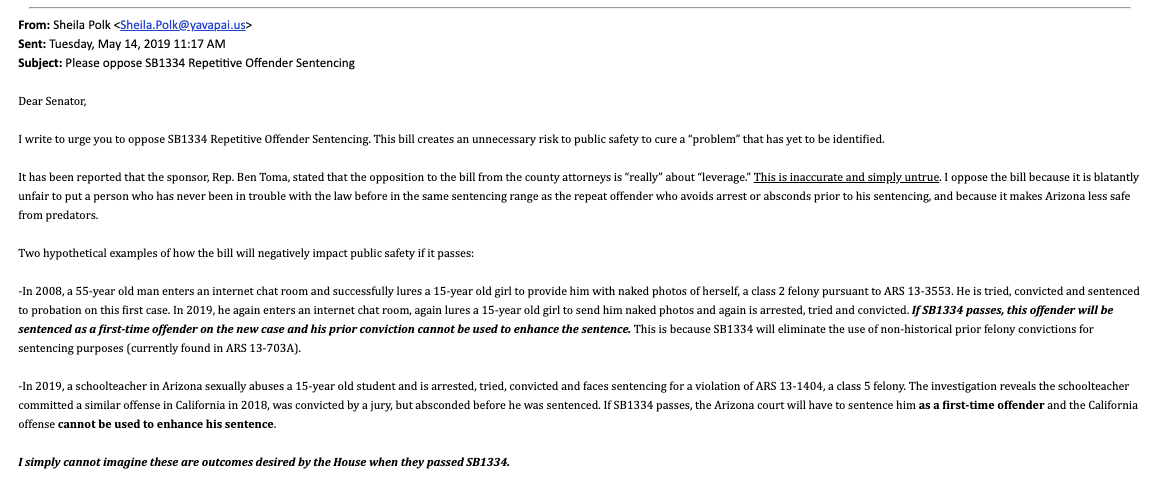 When Feinman refused, the county attorney called the Daily Star to complain – and the Daily Star deleted the entire op-ed from its website, without issuing a correction or calling Feinman’s sources, who confirmed to Phoenix New Times that Polk had indeed lobbied against the bill. Though Polk eventually signed onto the sentencing reform bill as neutral, emails shared with New Times show Polk had explicitly asked lawmakers to oppose the bill.