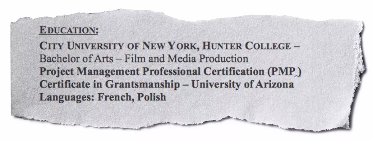 A copy of the resume provided to New Times shows that Godzich wrote “City University of New York, Hunter College – Bachelor of Arts – Film and Media Production,” leading the reader to believe that the applicant was a college grad.