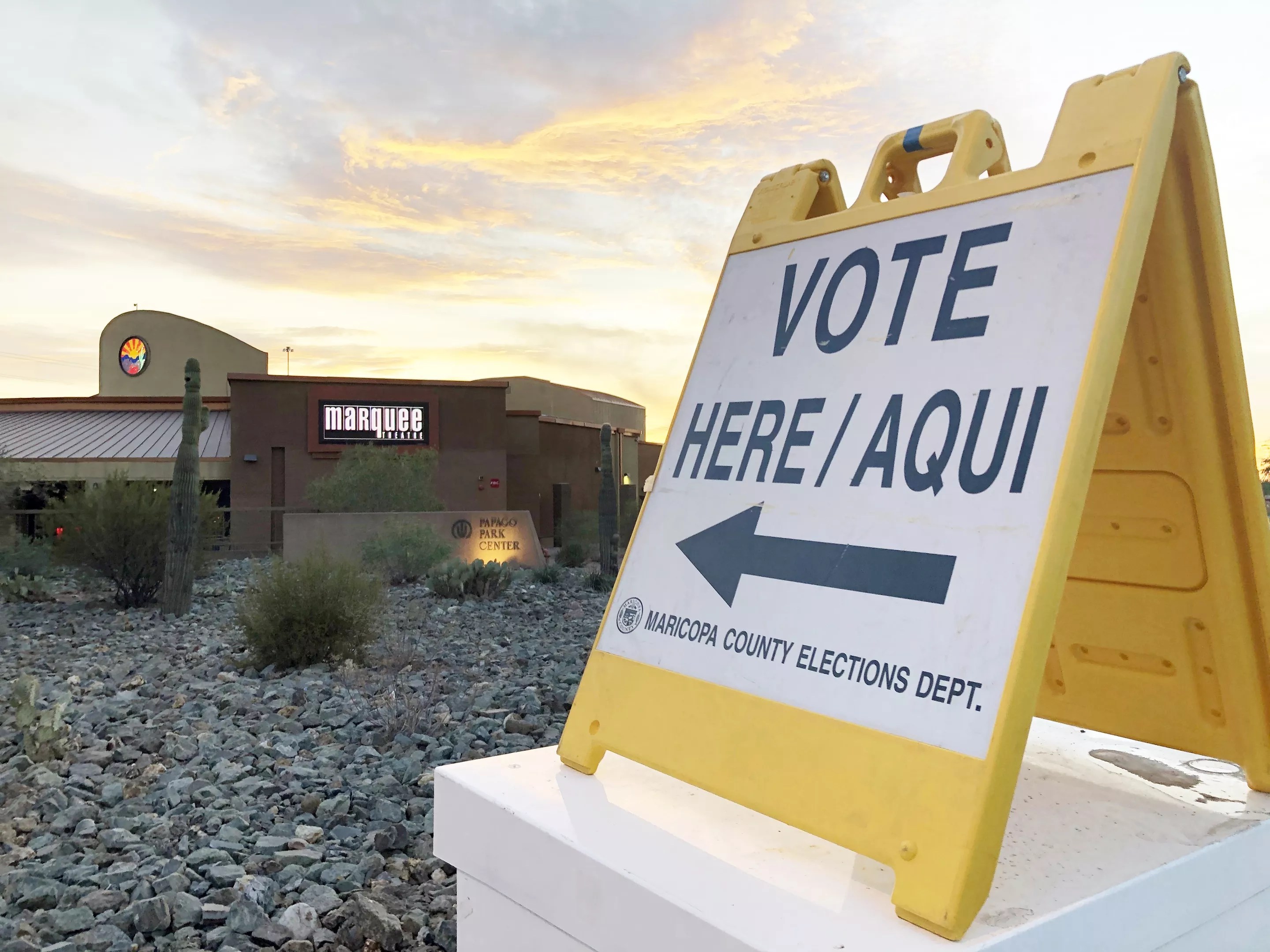 A sign directing voters to the polling place at Marquee Theatre in Tempe.