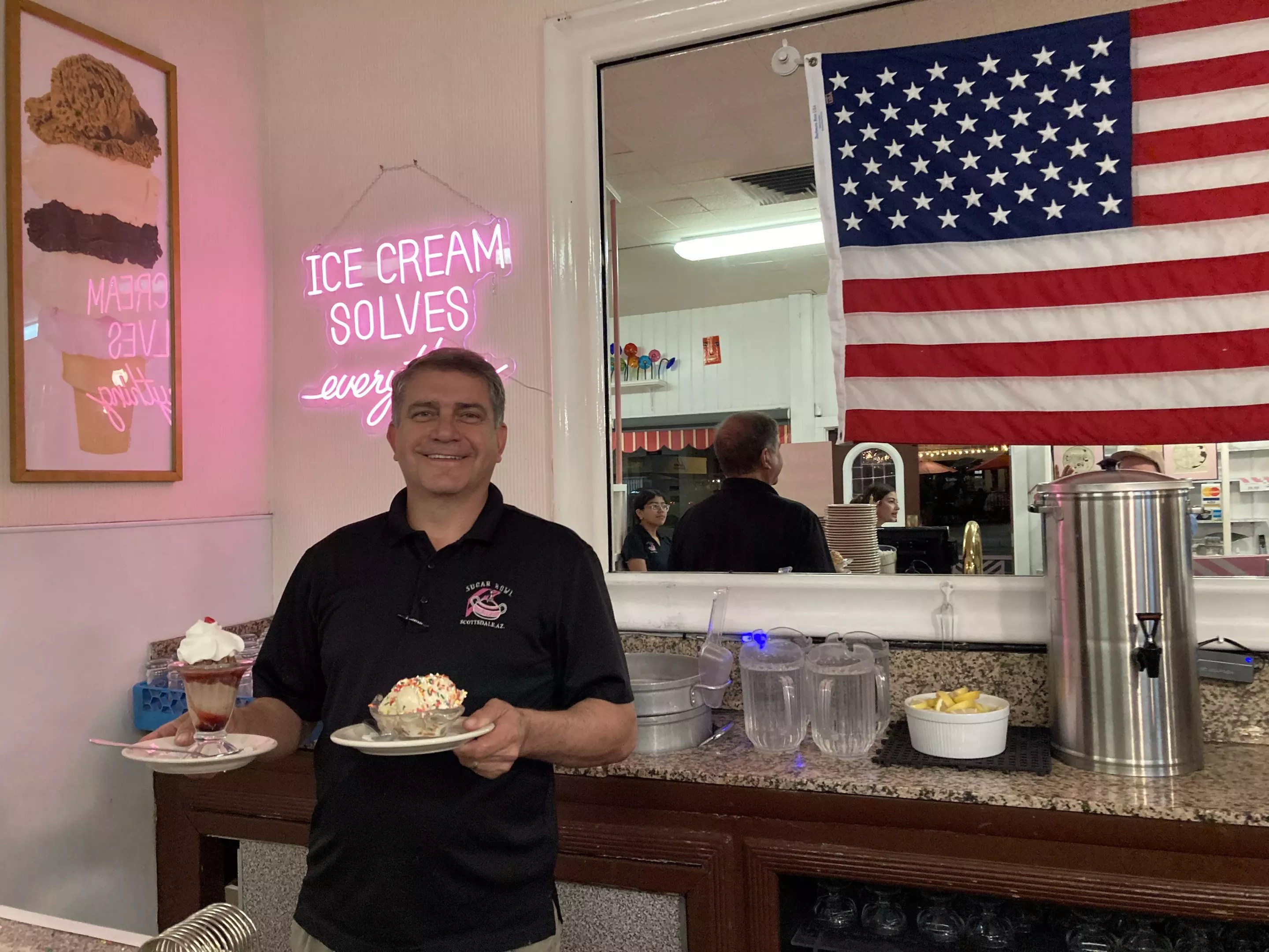 Ricky Gonzalez, the assistant manager at Sugar Bowl in Old Town Scottsdale, served up ice cream sundaes on election night. He has worked at the parlor since 1985, and worked several election evenings since then. 7:11 p.m.: Live music at polling places