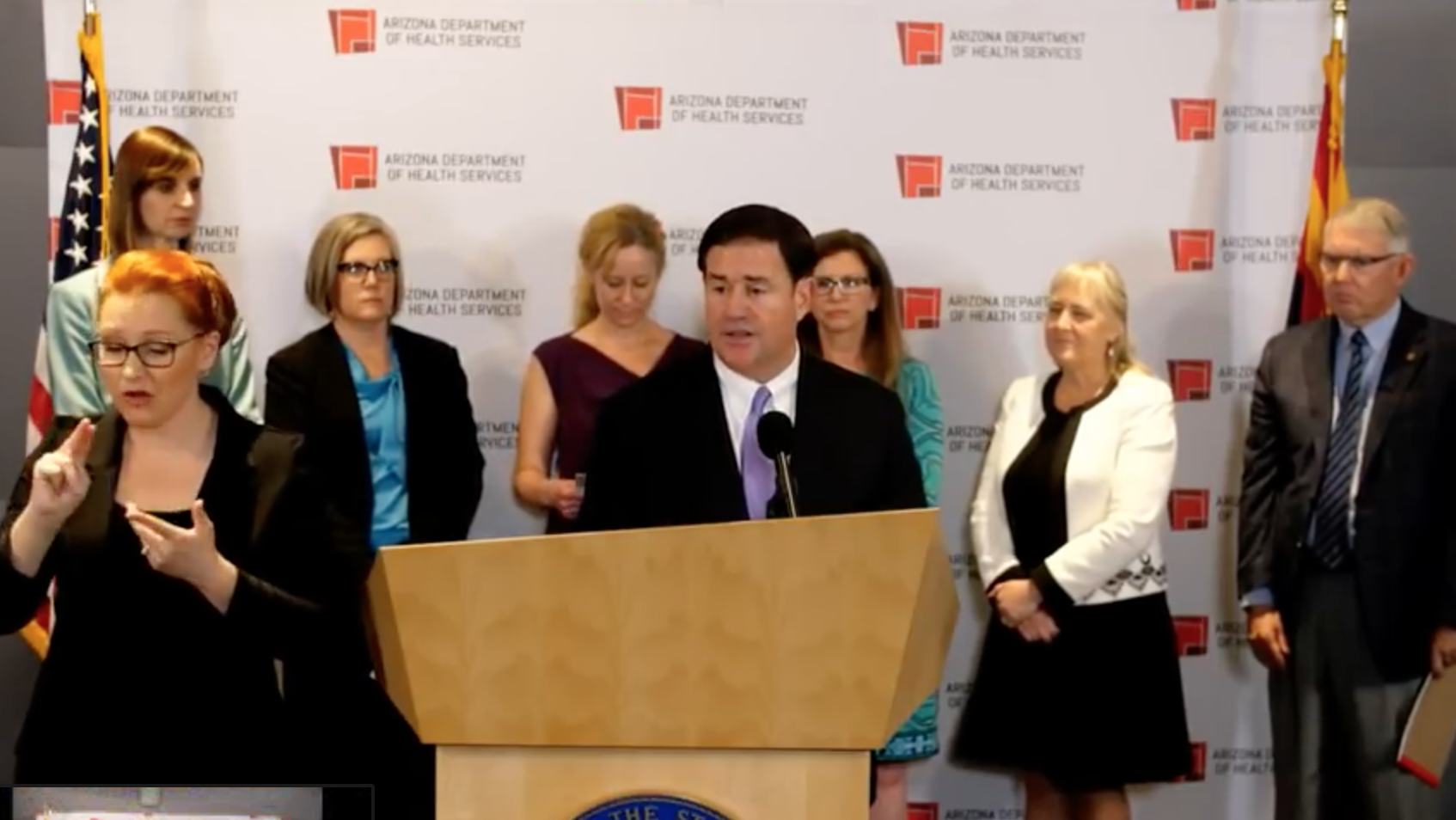 Arizona Governor Doug Ducey, center. Former director of emergency management Wendy Smith-Reeve stands in back, wearing teal.