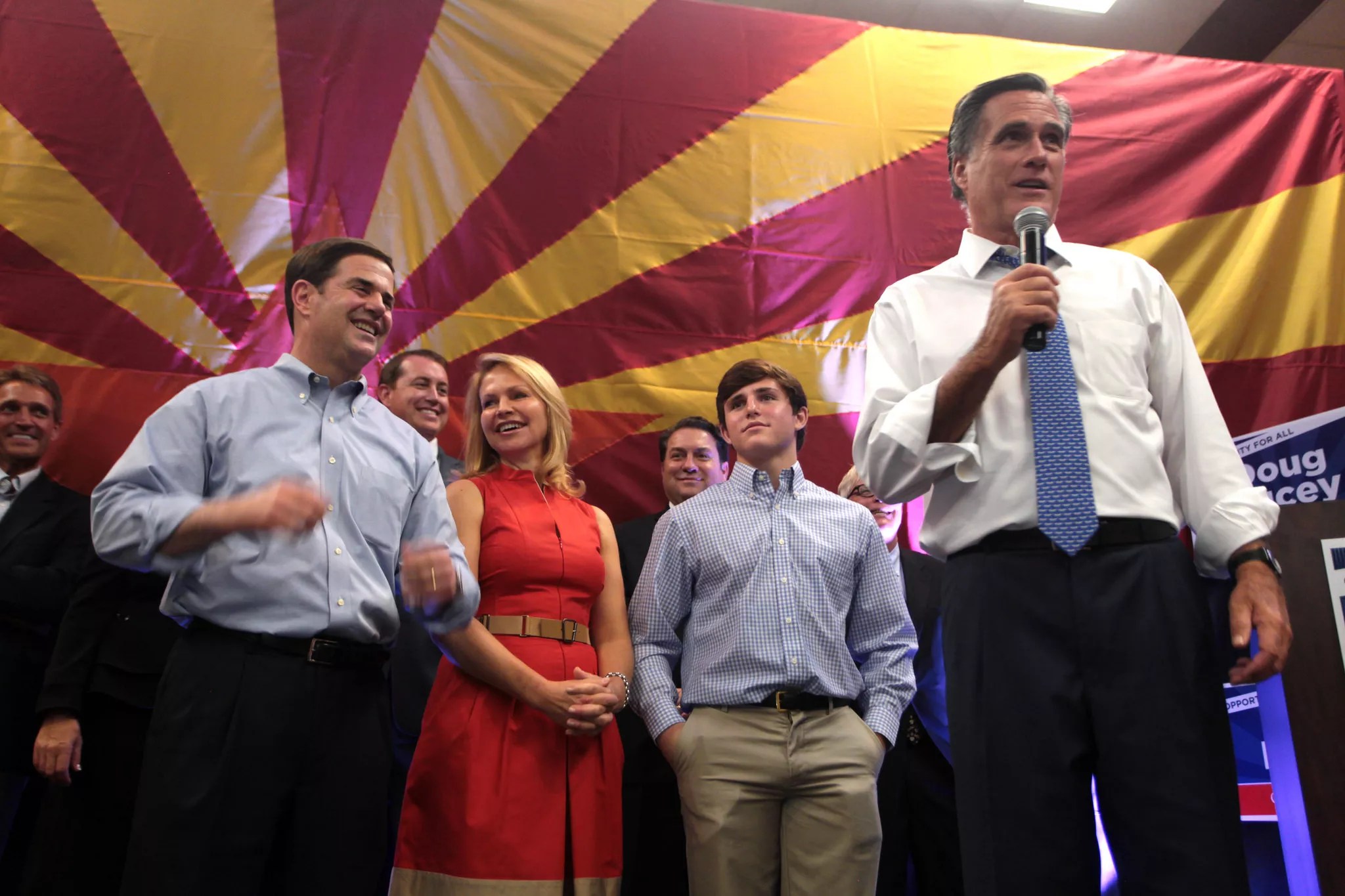 Joe Ducey, second from right, in 2014 at a political rally with his parents, Mitt Romney, Jeff Flake, and Mark Brnovich.