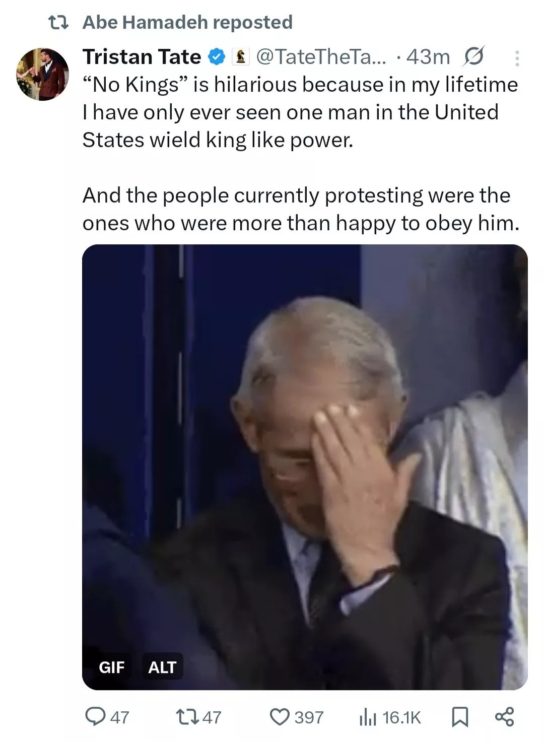 Hamadeh’s personal account follows both brothers on X, where they have a combined 14.1 million followers. (Other Republican Arizona politicians, such as state Sen. Janae Shamp and Arizona House Speaker Steve Montenegro, also follow Andrew Tate, the more famous of the two.) And when 36-year-old Tristan Tate acerbically tweeted about the weekend’s “No Kings” protests – including a GIF of Anthony Fauci, the only man Tate said he’s seen “wield king like power” – Hamadeh smashed that retweet button.