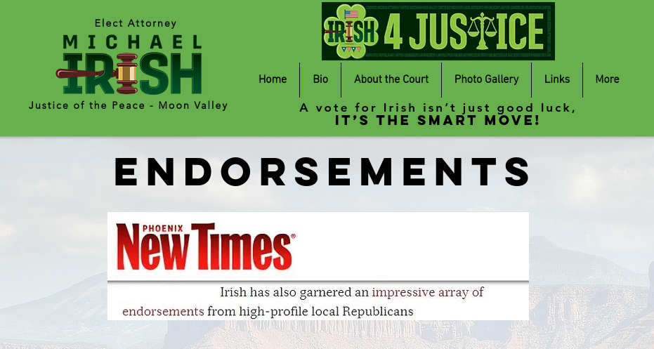 Michael Irish’s endorsements page selectively touts a Phoenix New Times story that chronicled his history of racism.