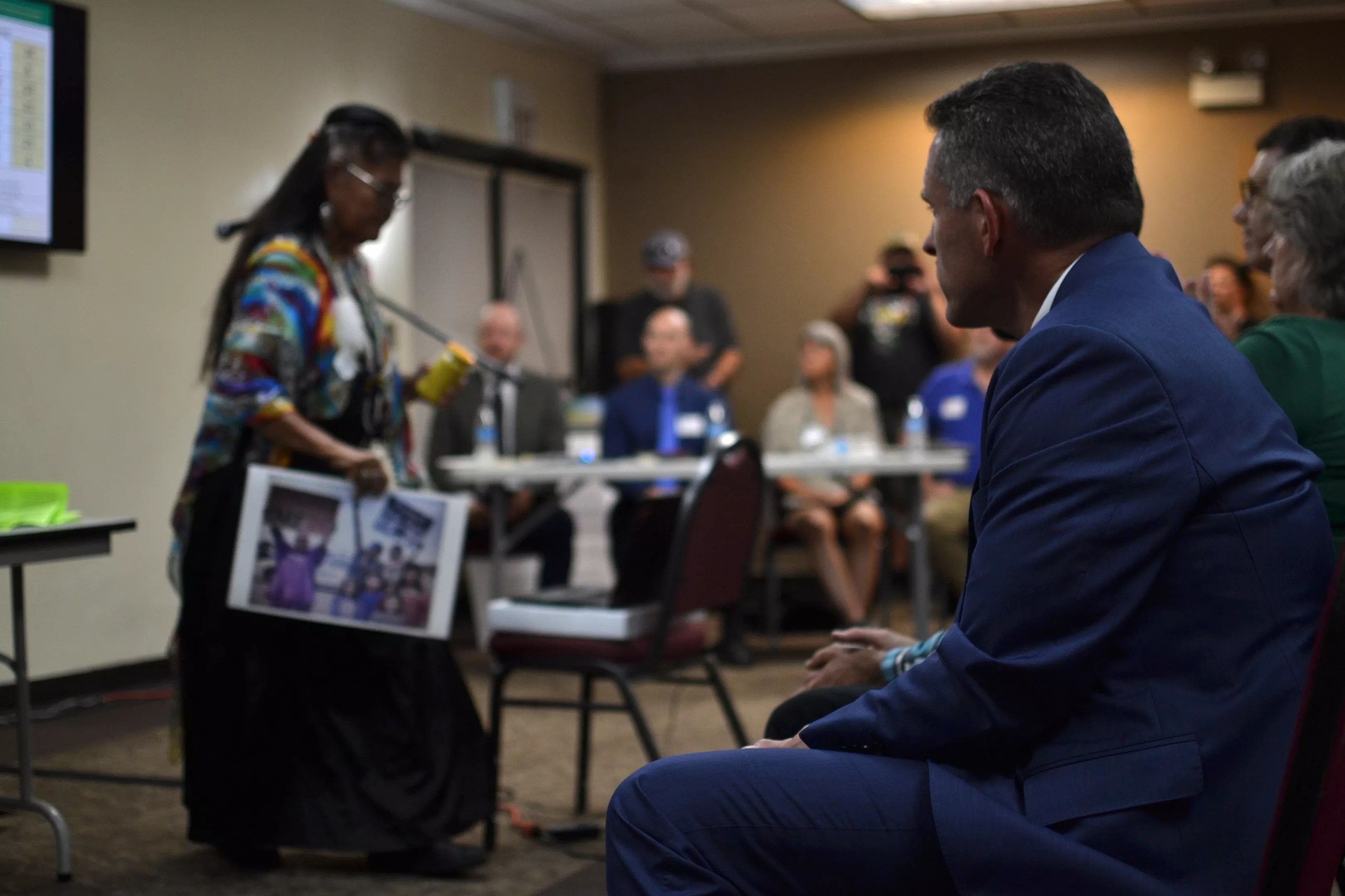 Scott Tressler of the Arizona Mining Association looks on as Sandra Rambler of the San Carlos Apache finishes speaking at the public hearing in Tempe on October 10, 2019.