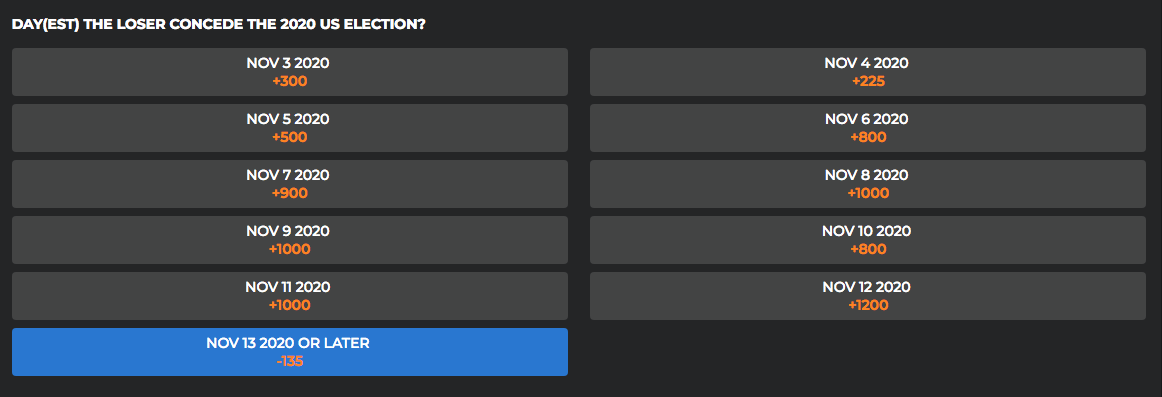 Somewhat terrifyingly, there’s a prop bet for which day the presidential loser will concede the election. On that bet, the favorite is “November 13 or later.”