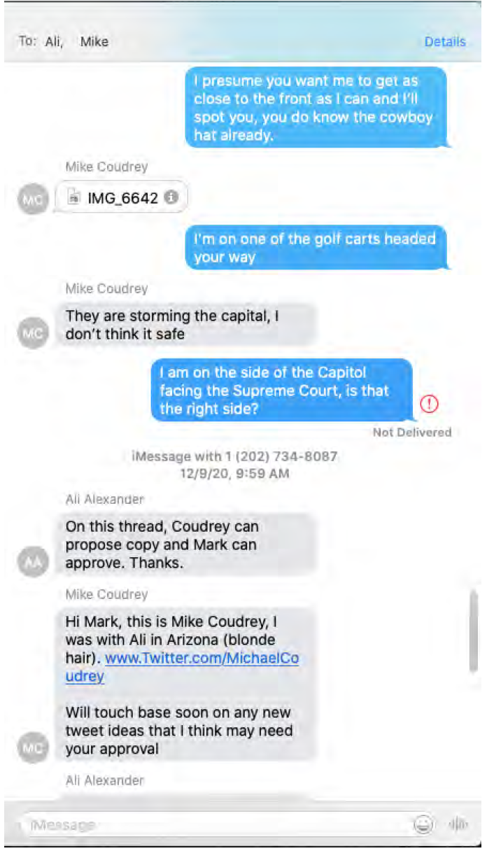 Another message from Finchem appears below Coudrey’s text about the riot, though it is undelivered: “I am on the side of the Capitol facing the Supreme Court, is that the right side?”