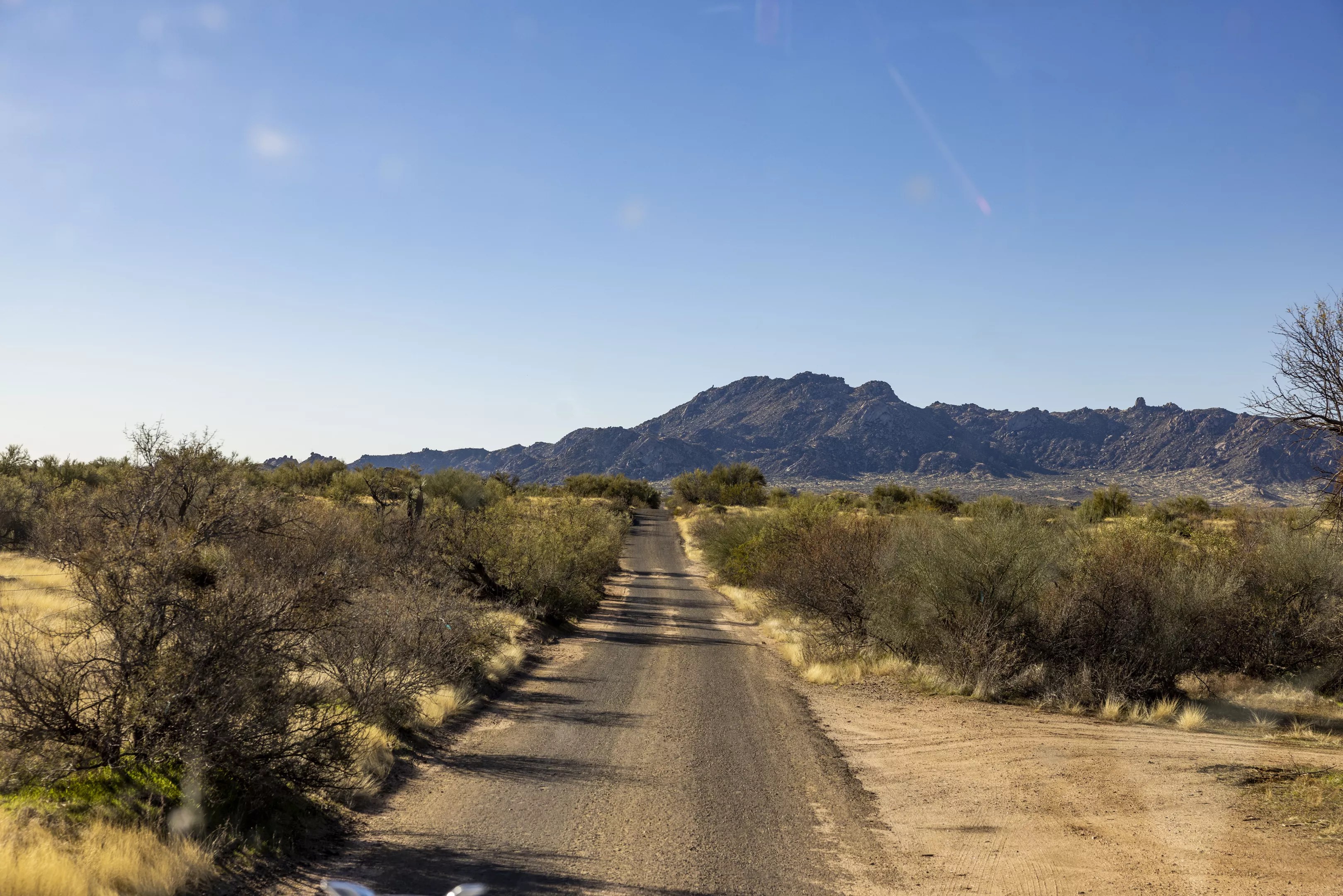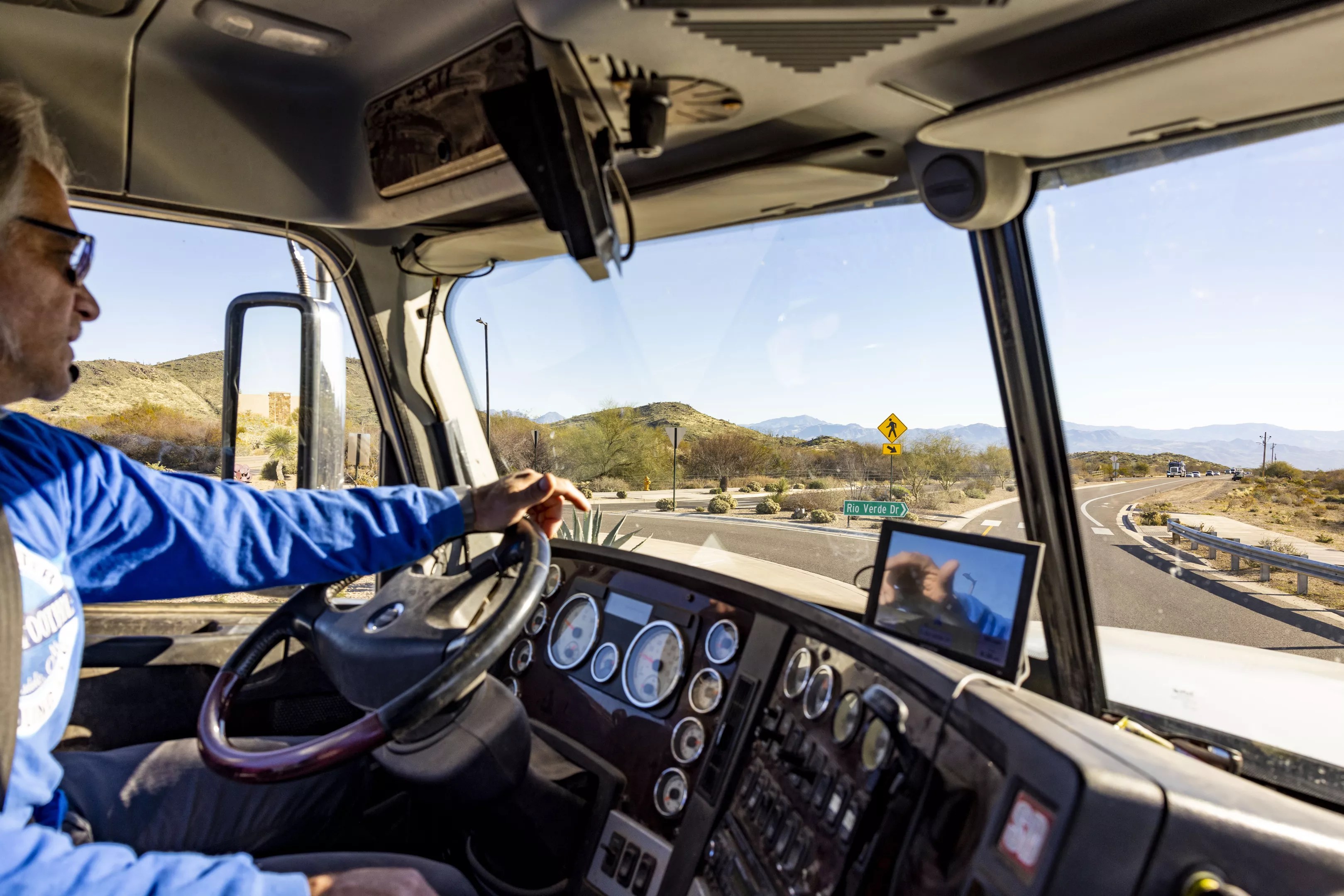 The view from the cabin of a water hauling truck in the Rio Verde Foothills.