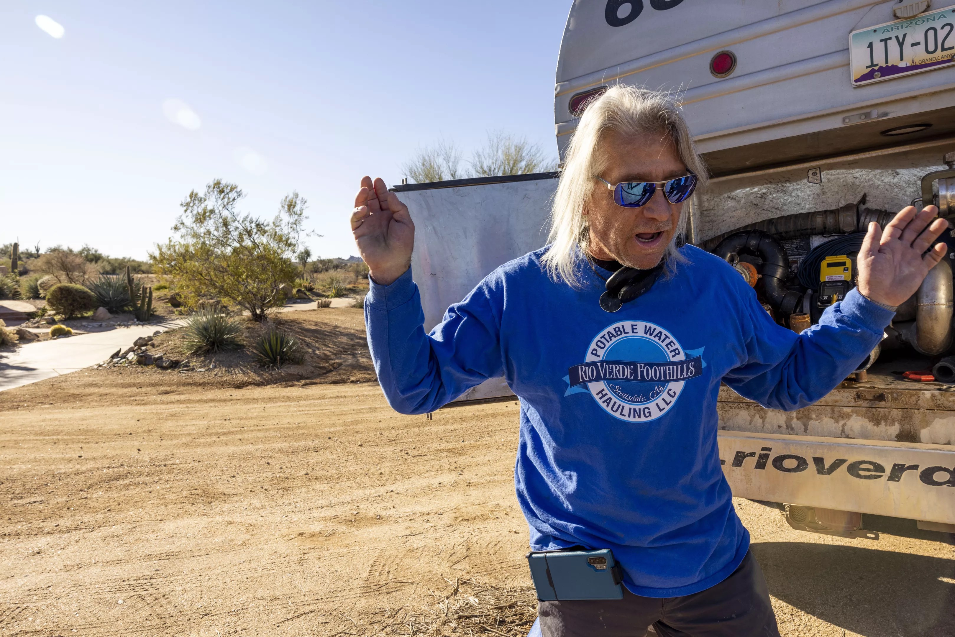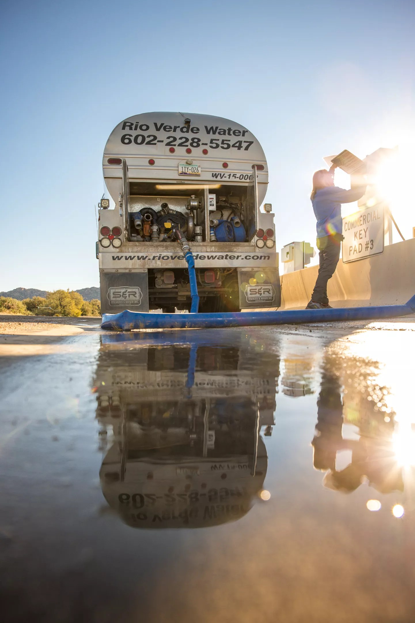 Like other Southwestern states, Arizona relies on water from the Colorado River to thrive. The river, via the Central Arizona Project, brings water to millions statewide. John Hornewer, co-founder of Rio Verde Water, connects his water hauling truck to the Scottsdale water station. Zee Peralta