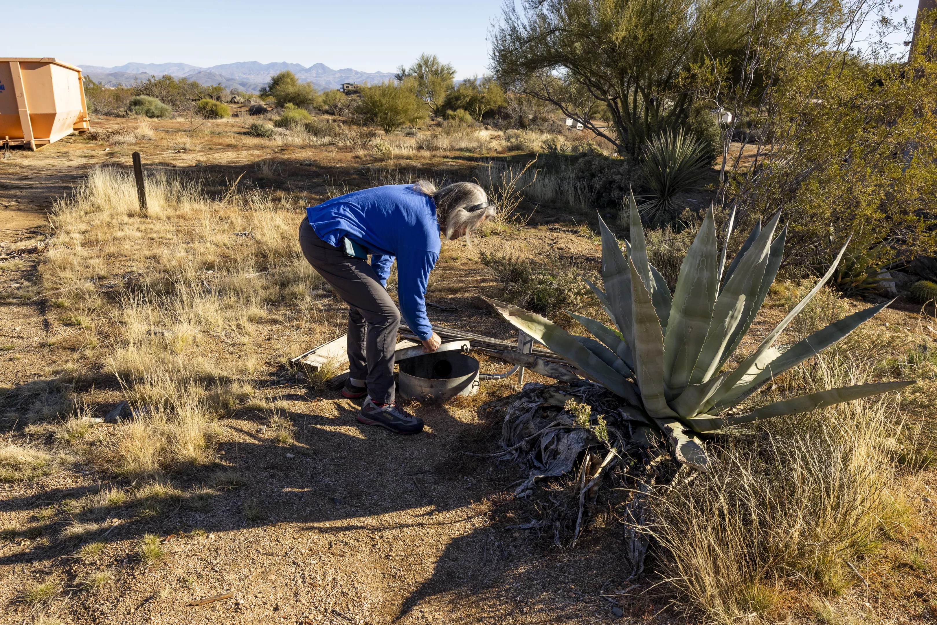 “The wide-open spaces, horses, and chickens. Hearing the coyotes serenade you at night. It’s just a great life,” she said. John Hornewer lifts the mouth of a cistern next to an agave plant in the Rio Verde Foothills. Zee Peralta