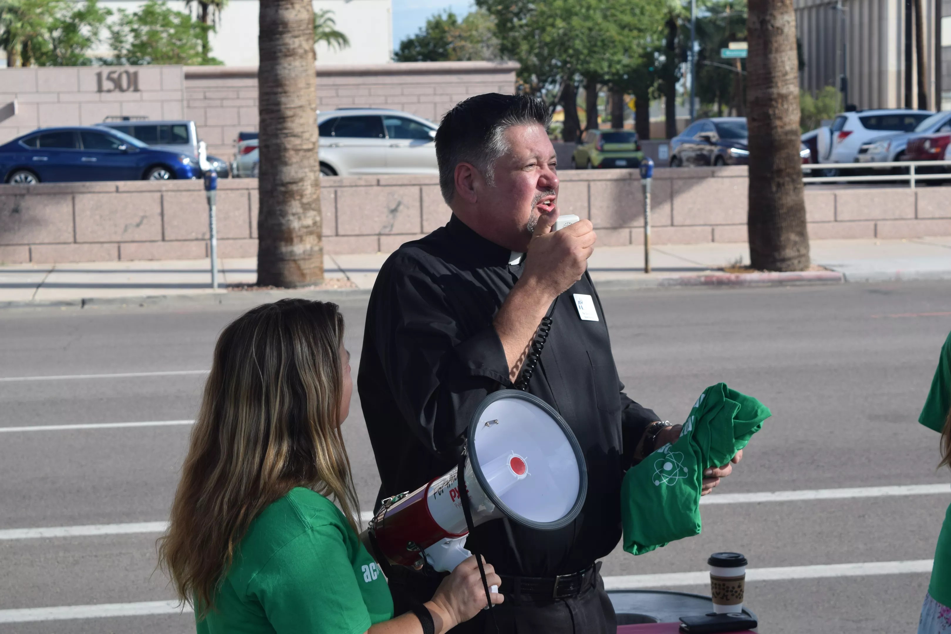 David Felten, a pastor at The Fountains United Methodist Church, argues for teaching evolution in schools during a September 24 rally at the Arizona Department of Education.