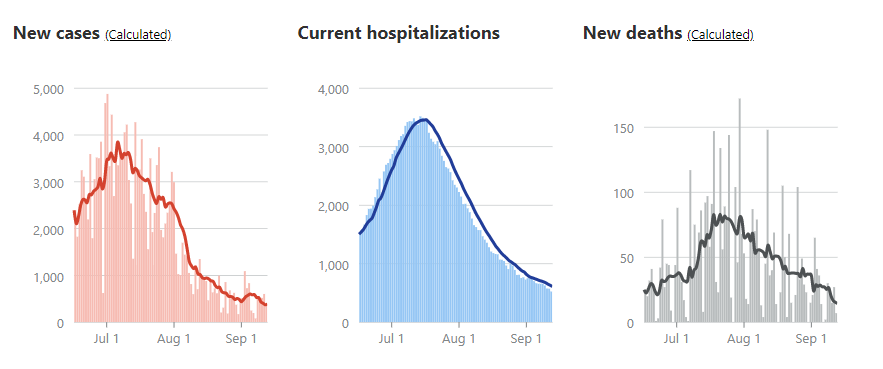 The seven-day average of new cases is back to where it was at the end of May. Hospital ICU bed capacity is around 80 percent, but only 10 percent of that is COVID-19 patients, the lowest proportion since April 10. No major post-Labor Day spike in case numbers appears to have emerged yet, although the beginning of the month saw a slight jump in cases that has since subsided.