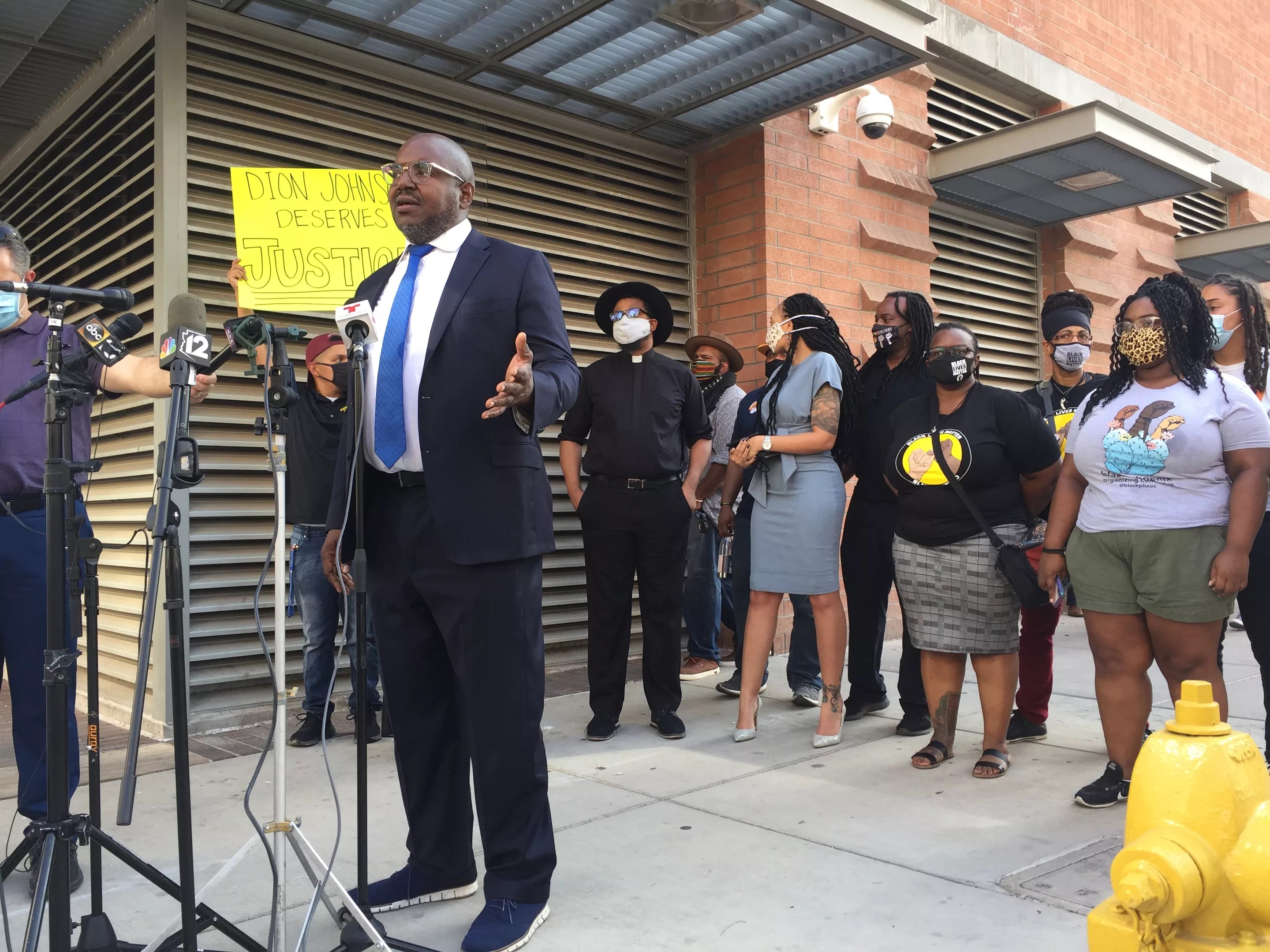 Jocquese Blackwell, the attorney representing Johnson’s family, speaks at a September 21 press conference on Adel’s charging decision.