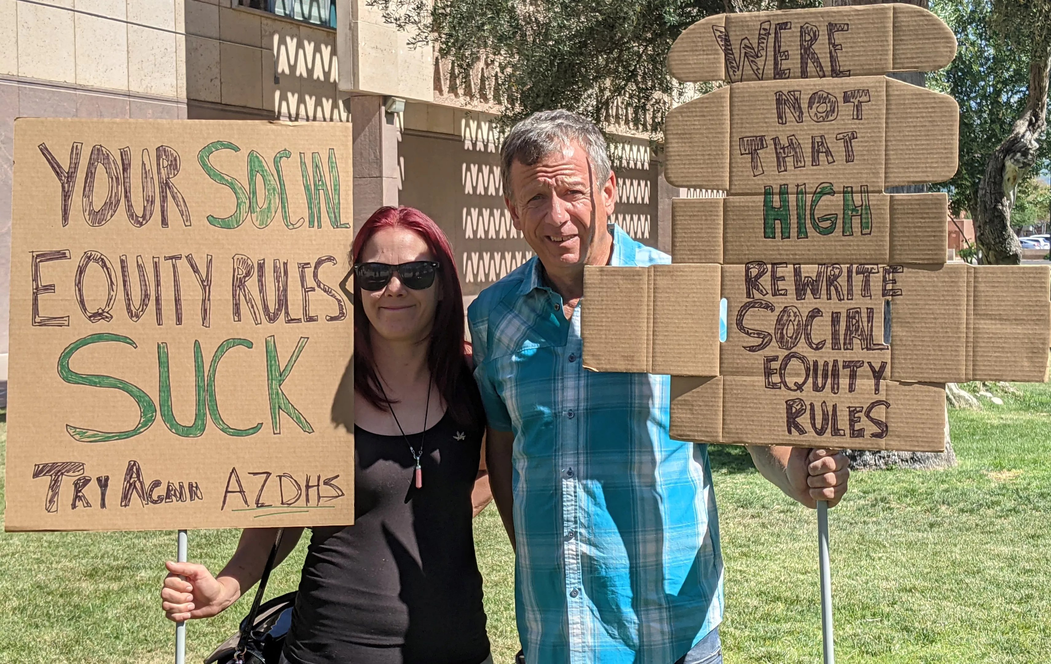 Cannabis advocates took their protests about the state’s “social equity” dispensary licenses to the Arizona State Capitol on Thursday morning, in a small rally that drew about two dozen people, including representatives from activist groups Arizona NORML and Our Arizona.