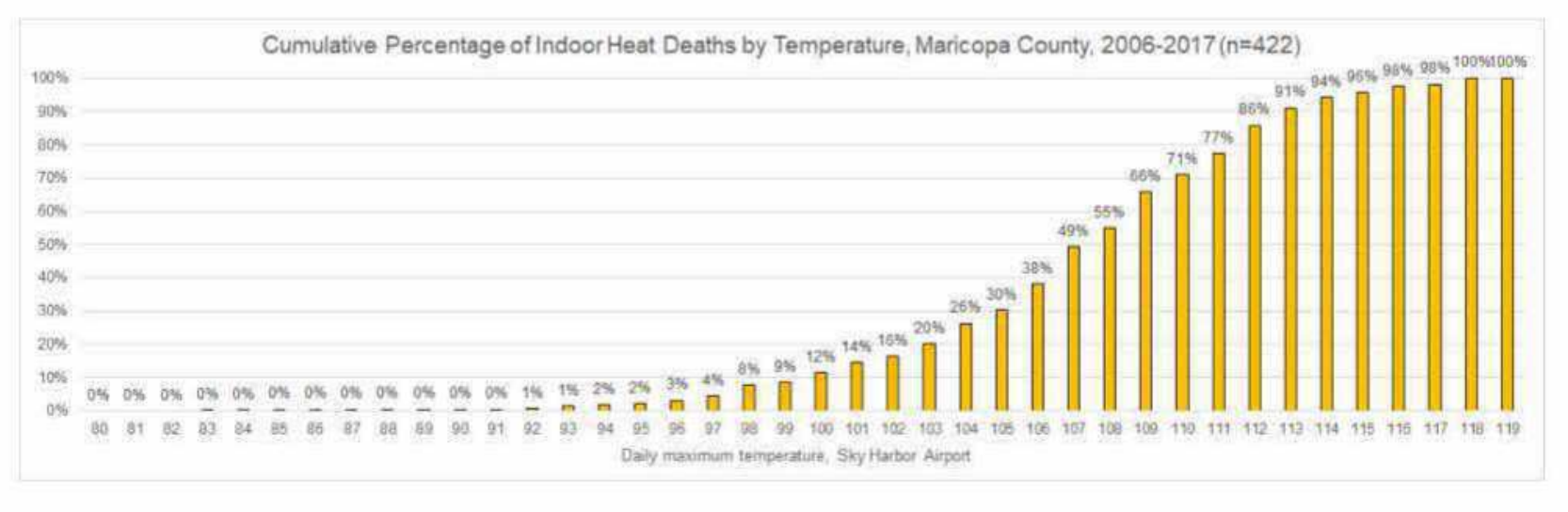 Of the 422 people who died indoors of heat-related causes from 2006 to 2017, 30 percent died when outdoor temperatures were 105 degrees or below, those data show.