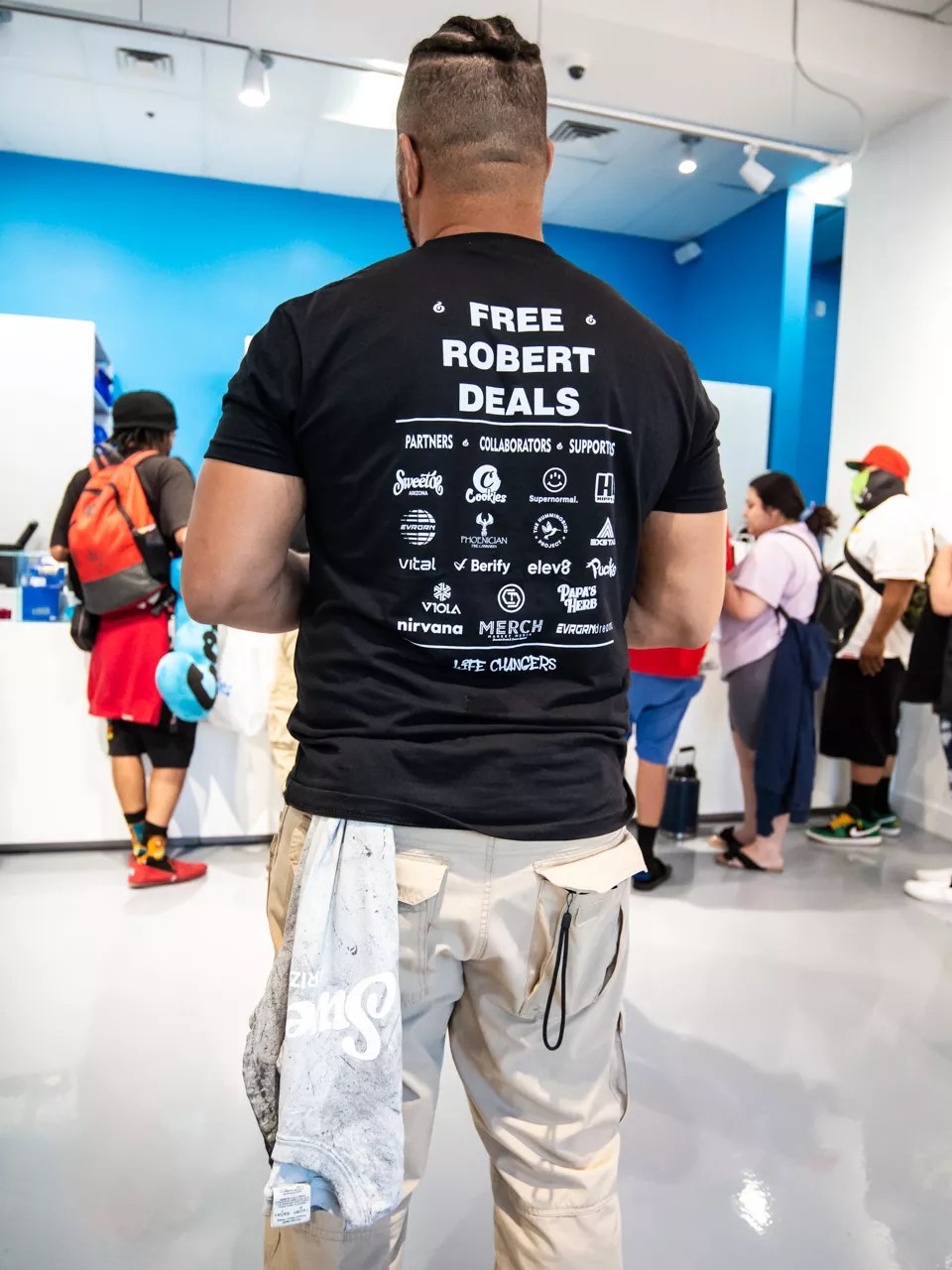 Custom T-shirts with Robert Deals’ name on them were worn by Cookies staff. They served as a reminder of the true meaning of the day: reparations for the unjust enforcement of previous marijuana laws.
