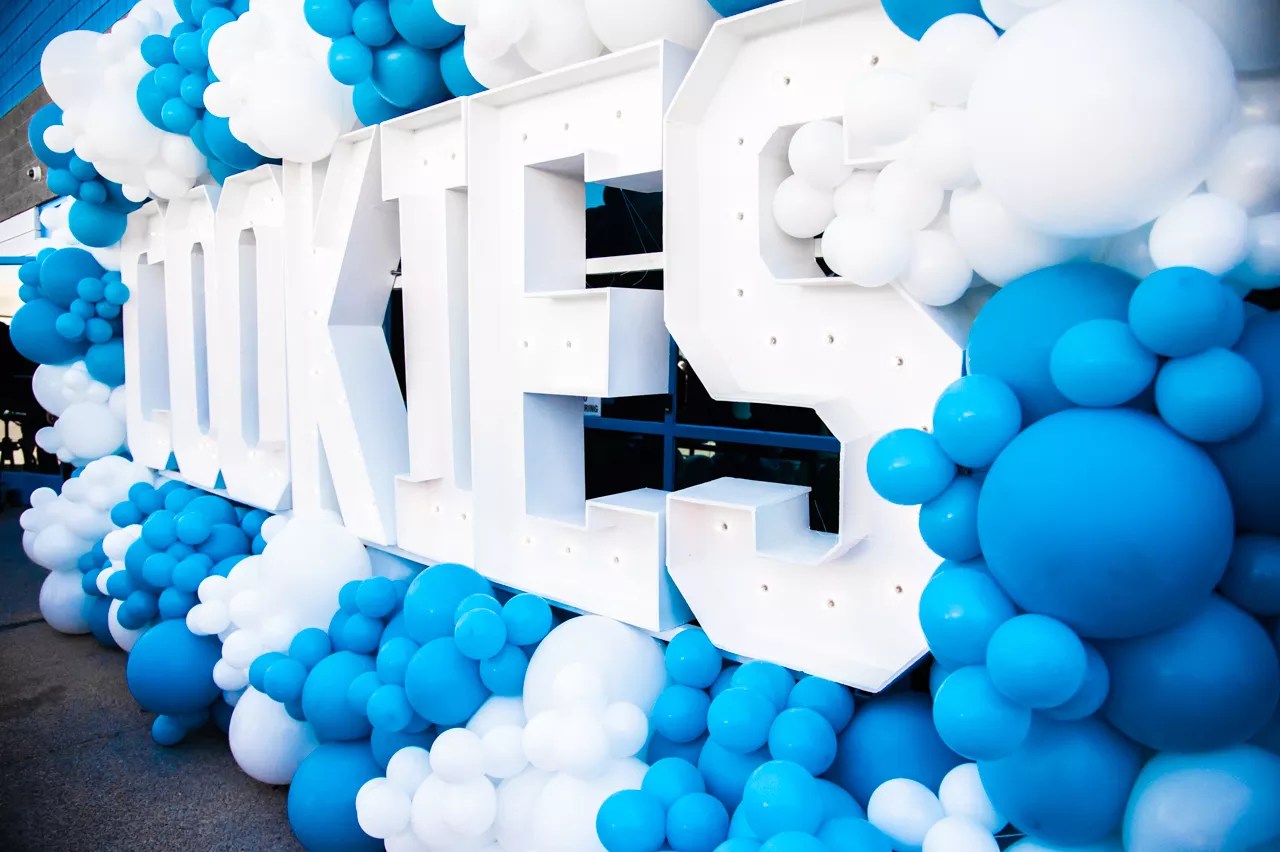 A giant powder blue-and-white balloon display was the backdrop for a step-and-repeat wall.