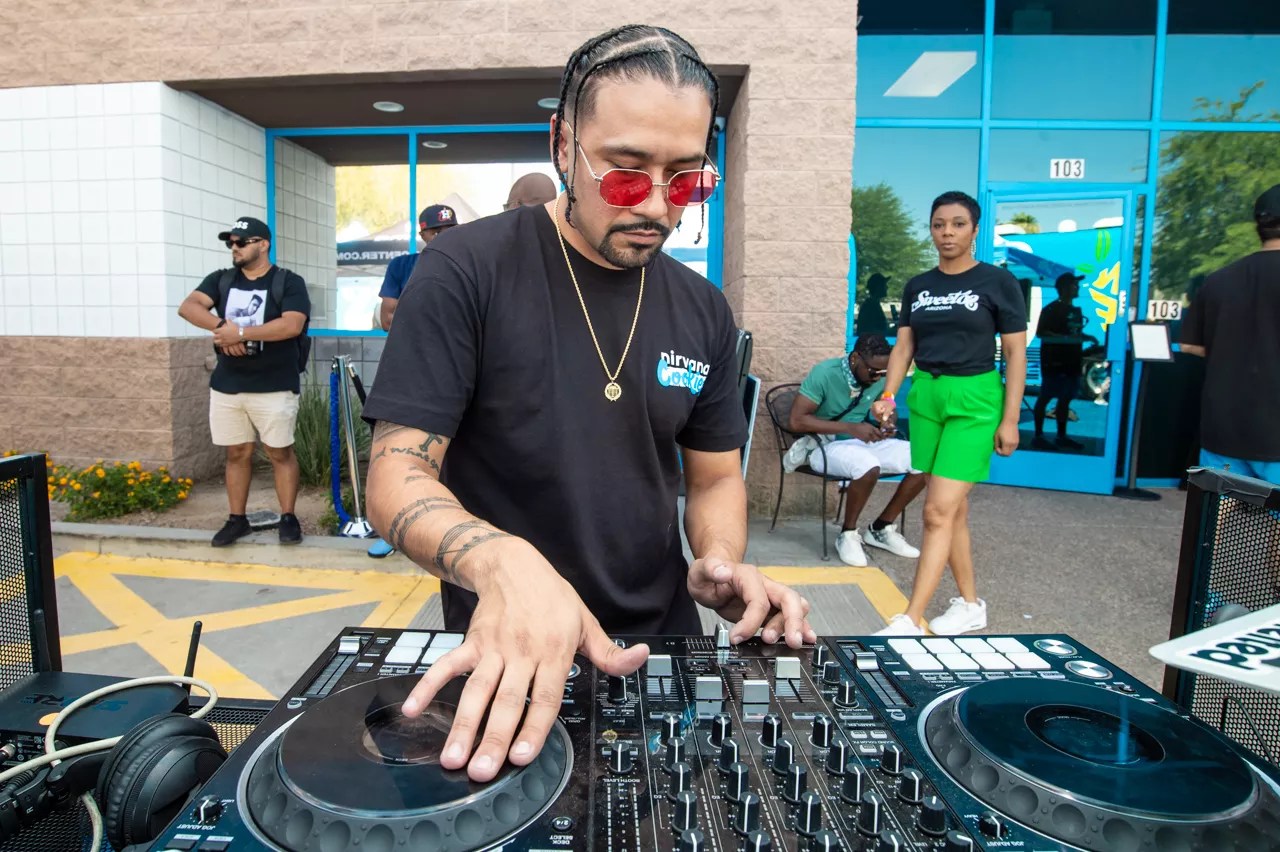 DJ Jetsteen kept the party rolling with epic hip-hop mashups at the Cookies dispensary opening in Tempe.