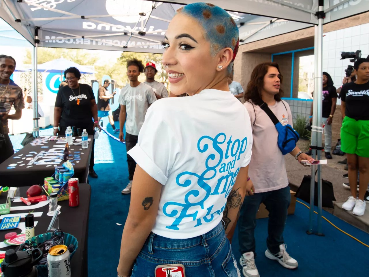 Ana Urias, a Pucks and Nirvana Center brand ambassador, was all smiles as she handed out free stickers and lighters.