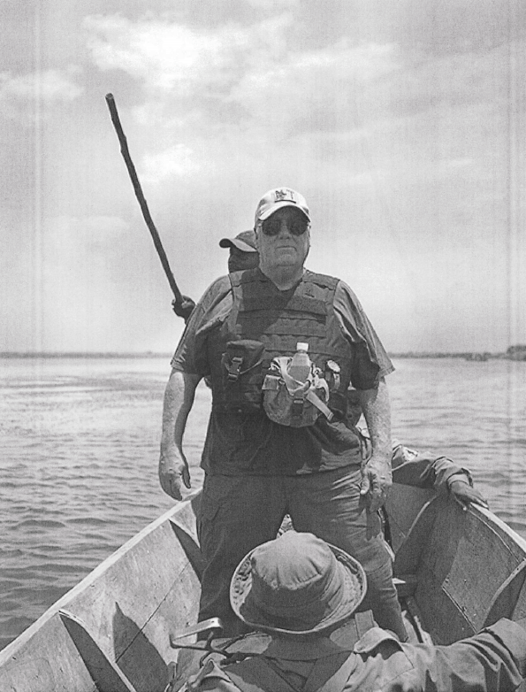 The photo depicts Buffett, standing in the center of a small, rough-hewn wooden boat, being ferried across Lake Edward in the Democratic Republic of the Congo. Buffett has long been involved in philanthropic activities in Africa.