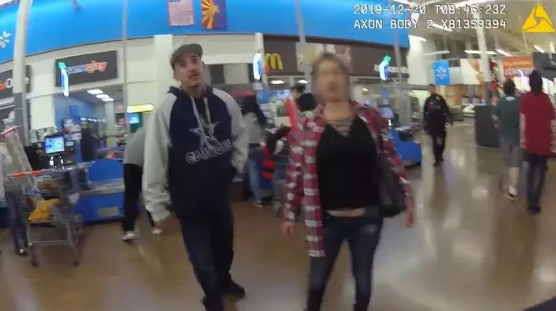 An officer confronts Mendoza and his girlfriend in a Walmart on December 20, 2019.