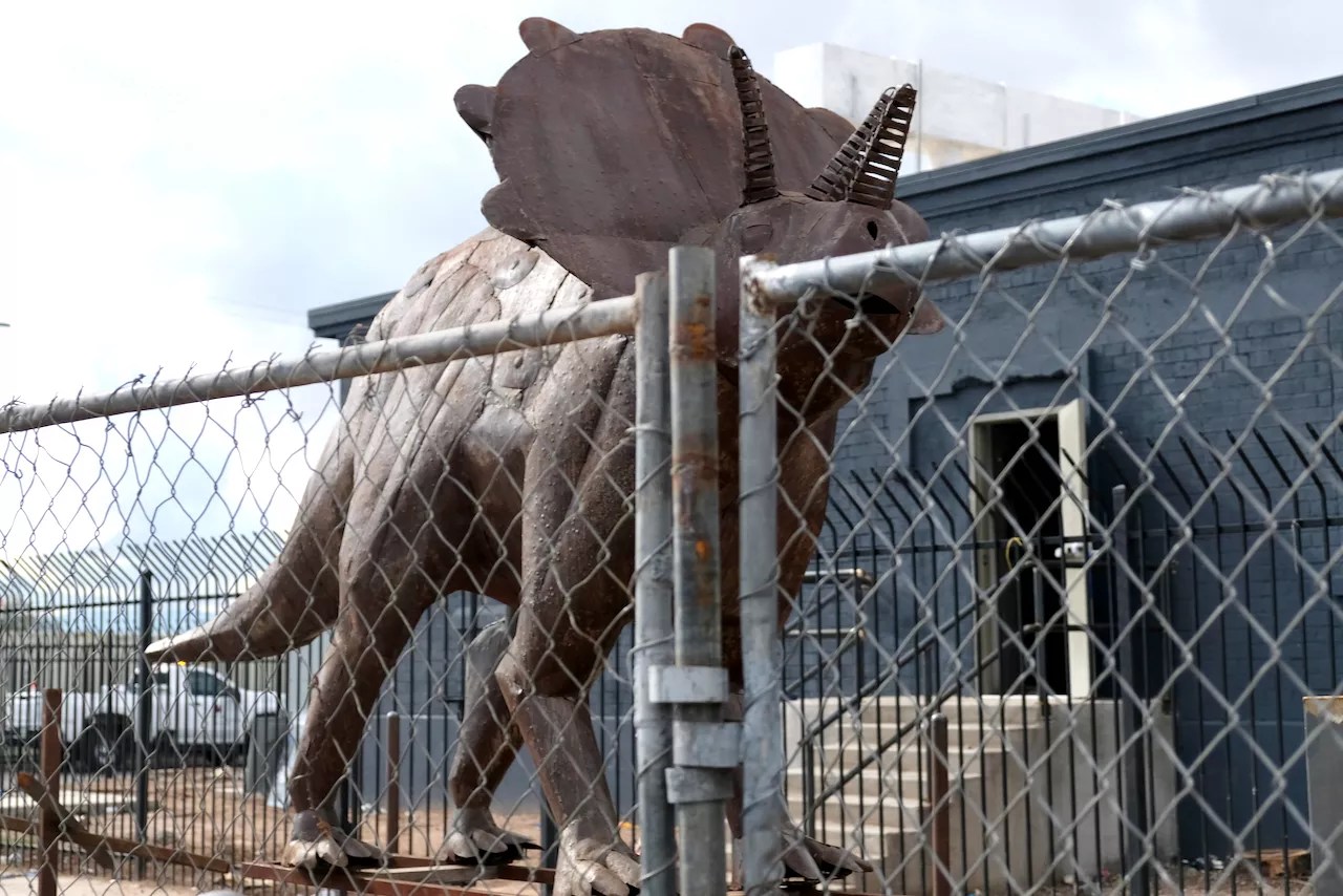 The metal sculptures adjacent to Maker Kitchens remain in place, including the large triceratops and some non-dinosaur creations, such a series of prickly pear cacti sculptures. For now, at least.